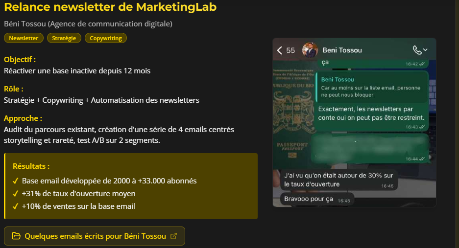 Mon parcours a commencé par le copywriting en 2023, avant une spécialisation exclusive en email marketing dès 2024. Ce qui a tout changé pour moi, c'est une phrase d'une cliente après plusieurs optimisations : « *Tu écris comme si c'était moi qui parlais à mes clients. Tu arrives à toucher exactement là où il faut quand il faut pour déclencher l'action. *»