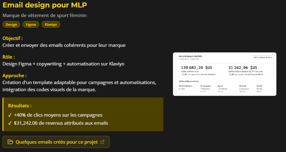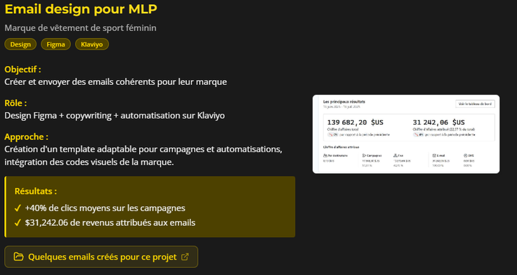 Je travaille exclusivement avec des marques e-commerce qui ont déjà une base email, déjà un outil en place, et qui veulent des résultats concrets, pas simplement "faire de l'email marketing".