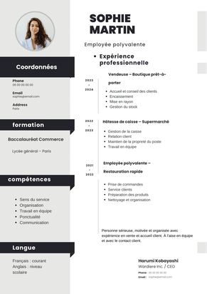 Bonjour, je propose la création de CV modernes, clairs et professionnels. J’aide à organiser vos informations pour obtenir un CV lisible et efficace. N’hésitez pas à me contacter avant commande.