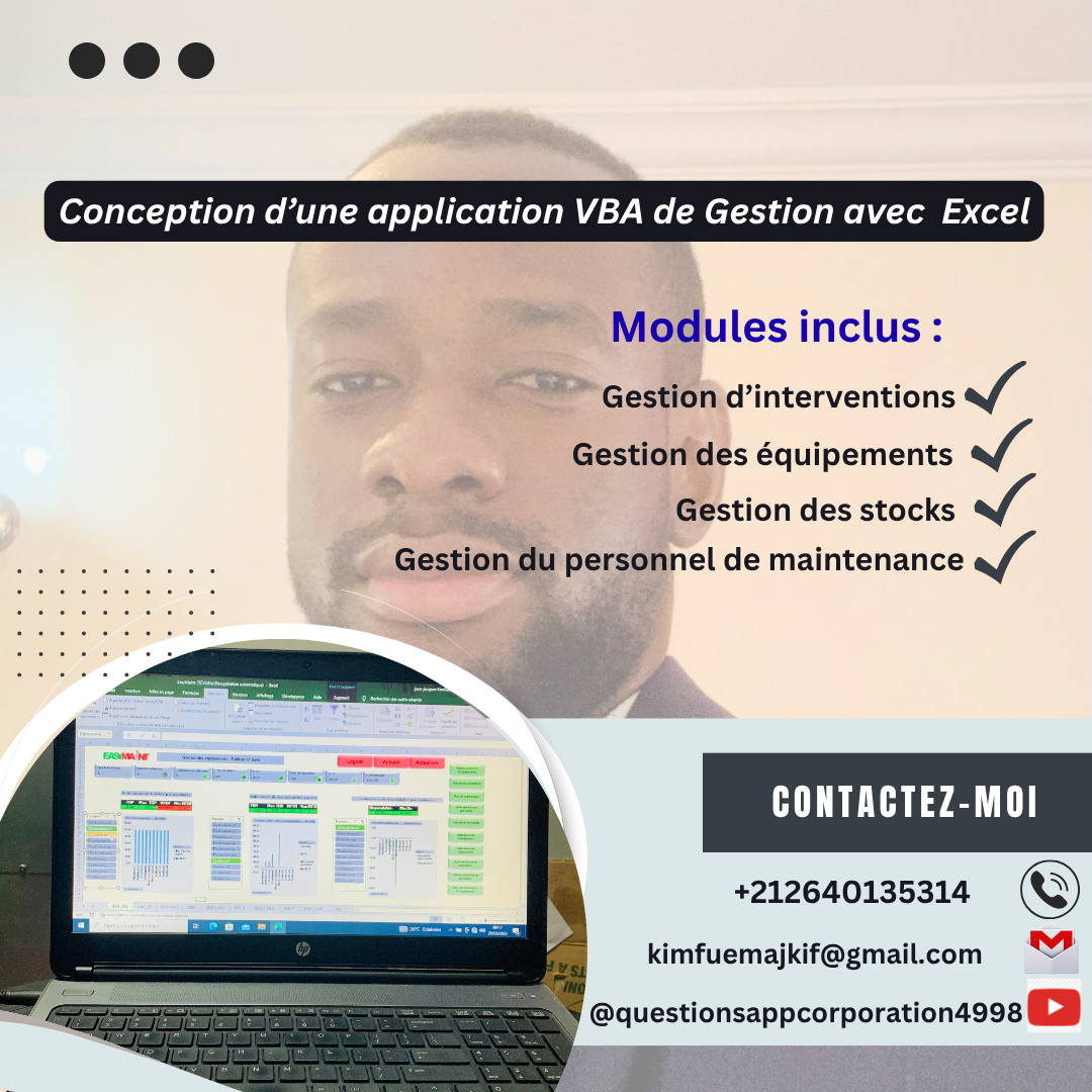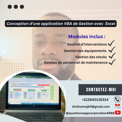 Je suis à votre disposition pour vous aider à : • Digitaliser vos opérations de maintenance • Automatiser vos fichiers et processus métier • Analyser vos données et visualiser vos indicateurs clés