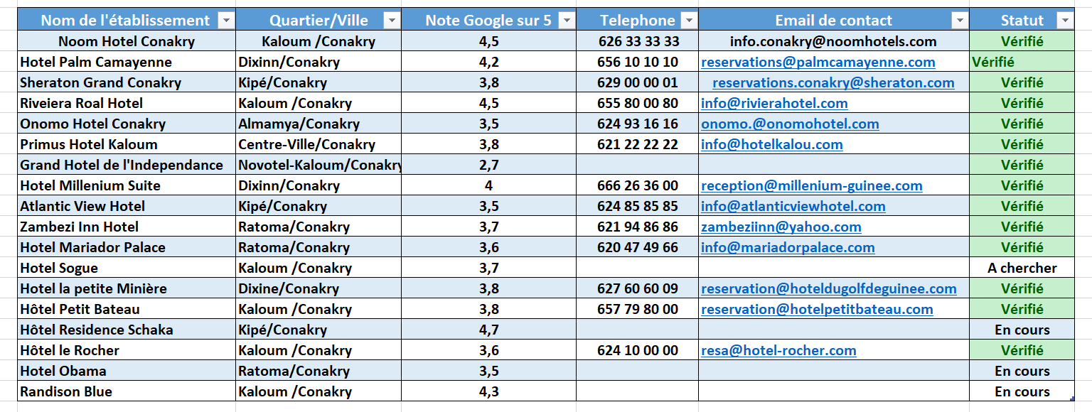 Maîtrise d'Excel / Google Sheets : Je ne fais pas que remplir des cases. Je structure vos fichiers, j'utilise des formules et je nettoie vos bases de données pour les rendre professionnelles. Recherche Web experte : Besoin de trouver des emails, des numéros de téléphone ou des infos spécifiques ? Je sais fouiller le web pour extraire les données dont vous avez besoin. Confidentialité : Vos données sont précieuses et je m'engage à une discrétion totale.** Mes domaines d'intervention :** Saisie de données : Transfert de documents (PDF, images, manuscrits) vers Excel, Word ou votre logiciel métier. **Constitution de bases de données : **Recherche de prospects B2B, annuaires spécialisés (hôtels, entreprises, etc.). **Assistance administrative : **Gestion d'emails, mise en page de documents, support client. Nettoyage de fichiers : Suppression des doublons, correction des erreurs de formatage. Mon engagement : Une livraison rapide, une communication fluide et un travail soigné qui respecte scrupuleusement vos consignes.