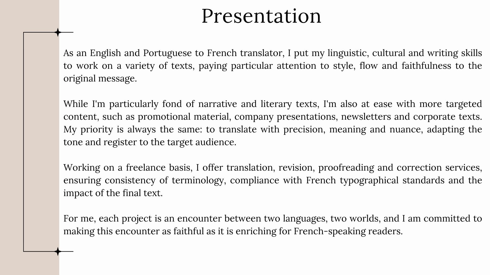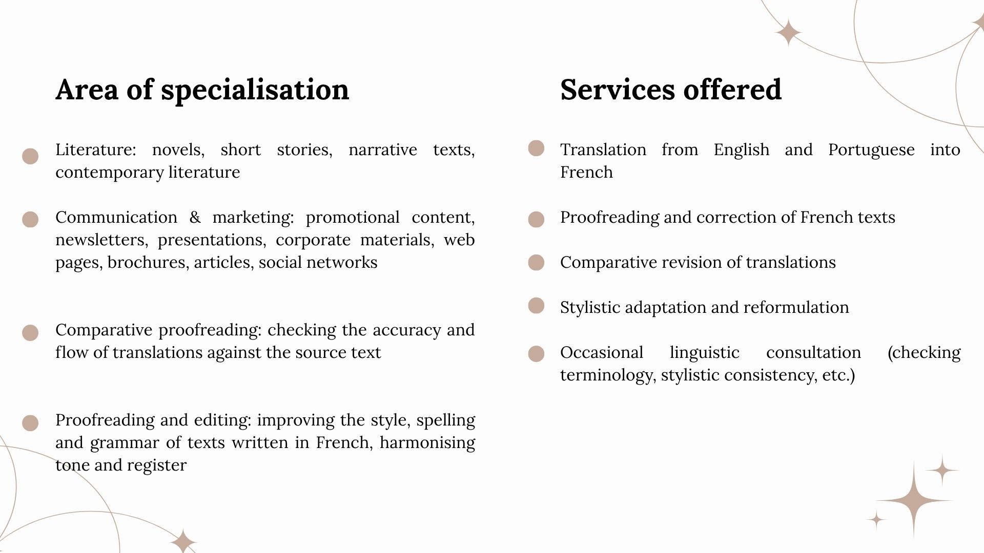 Traductrice freelance (EN/PT > FR) spécialisée en littérature, édition et communication. Traduction, relecture et post-édition. Textes variés : romans, livres, contenus web, pro & culturels.