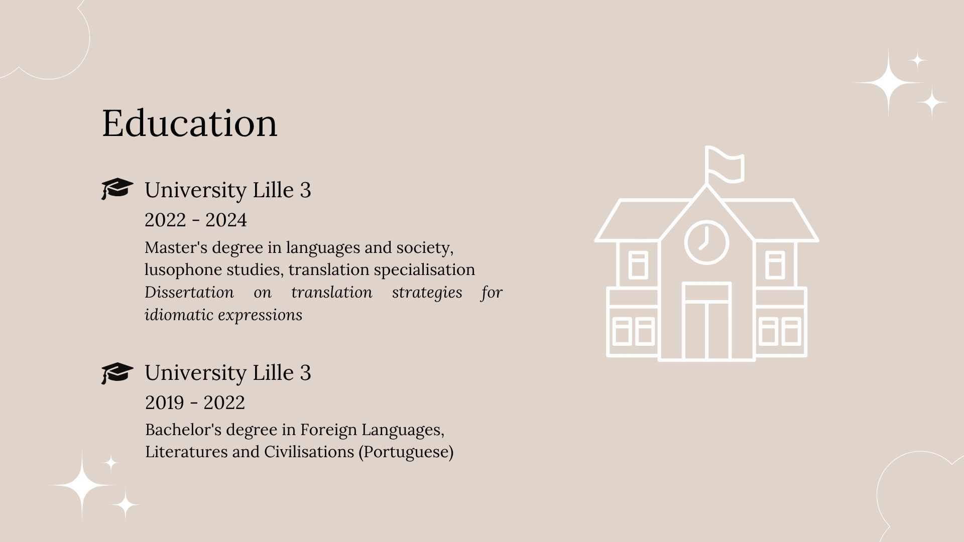 - Master Langues et société, études lusophones, spécialisation traduction Université de Lille ‐ juin 2024