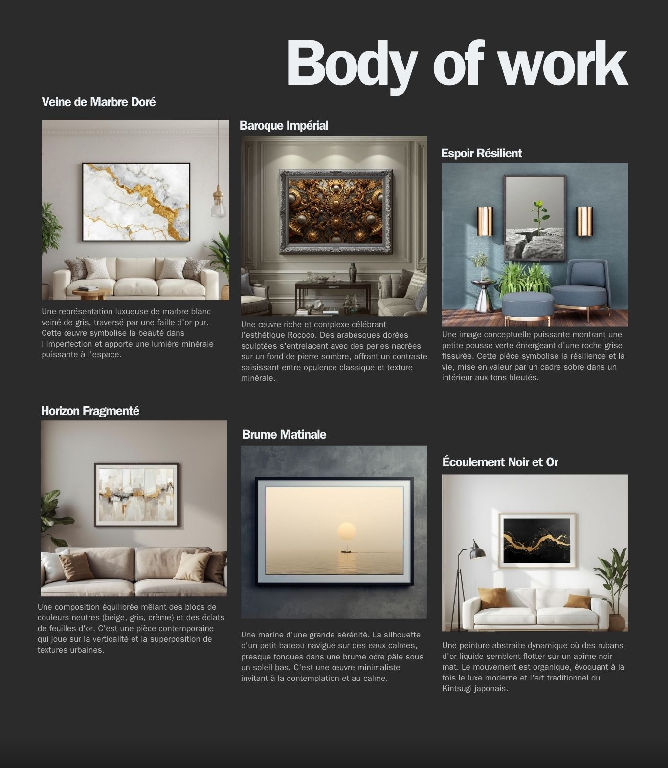 Conception et vente d’œuvres originales personnalisées pour espaces professionnels et particuliers. Conseils sur les formats, couleurs et styles adaptés aux besoins des clients. Livraison d’œuvres prêtes à exposer avec un design moderne et impactant. -