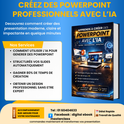 Je vous aide à créer des présentations PowerPoint professionnelles grâce à des intelligences artificielles puissantes et faciles à utiliser. Au lieu de passer des heures à faire vos slides, je vous montre les meilleures IA qui génèrent automatiquement des présentations modernes, bien structurées et visuellement attractives en quelques minutes. Que vous soyez étudiant, entrepreneur ou professionnel, vous pourrez créer des PowerPoint de qualité sans compétences en design. ✔ Accès aux meilleures IA pour PowerPoint ✔ Gain de temps énorme ✔ Résultats professionnels en quelques clics ✔ Explications simples et faciles à suivre Transformez votre façon de créer des présentations avec la puissance de l’IA.