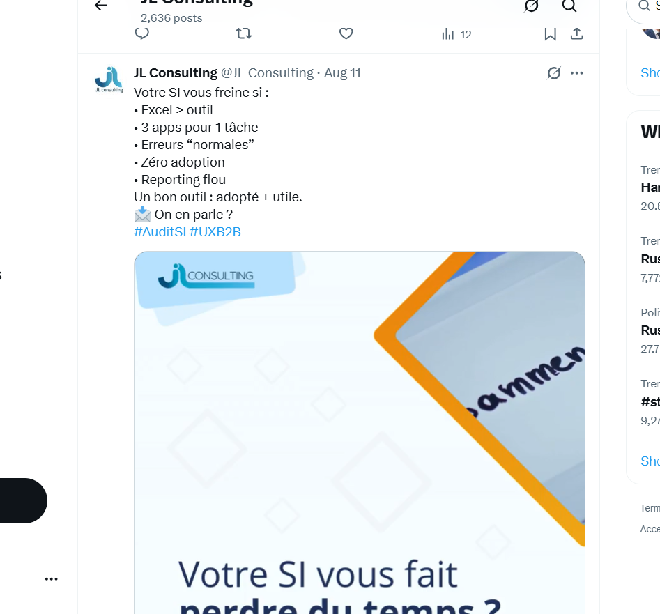 Rôle transversal chez JL Consulting : community management LinkedIn/Facebook/X, création de visuels, rédaction stratégique et réponses à appels d'offres. Gestion du recrutement de profils marketing digital. -