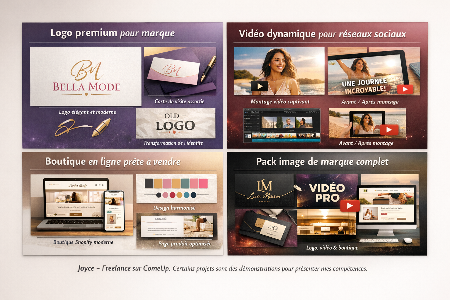 Je travaille sur : • Logos premium et harmonieux • Palettes de couleurs expressives • Typographies cohérentes • Contenus vidéo esthétiques (réseaux sociaux & YouTube) • Boutiques en ligne modernes et épurées -