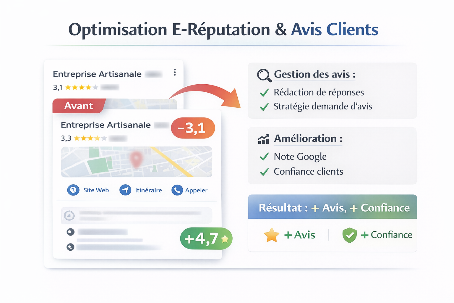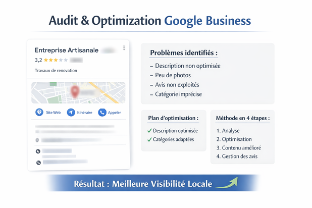 Audit de fiches Google Business Optimisation de présence locale Gestion d’e-réputation Structuration de visibilité digitale -
