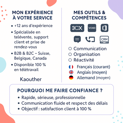 Je suis Kaouther, professionnelle expérimentée avec plus de 12 ans dans le service client, dont 4 ans en freelance.