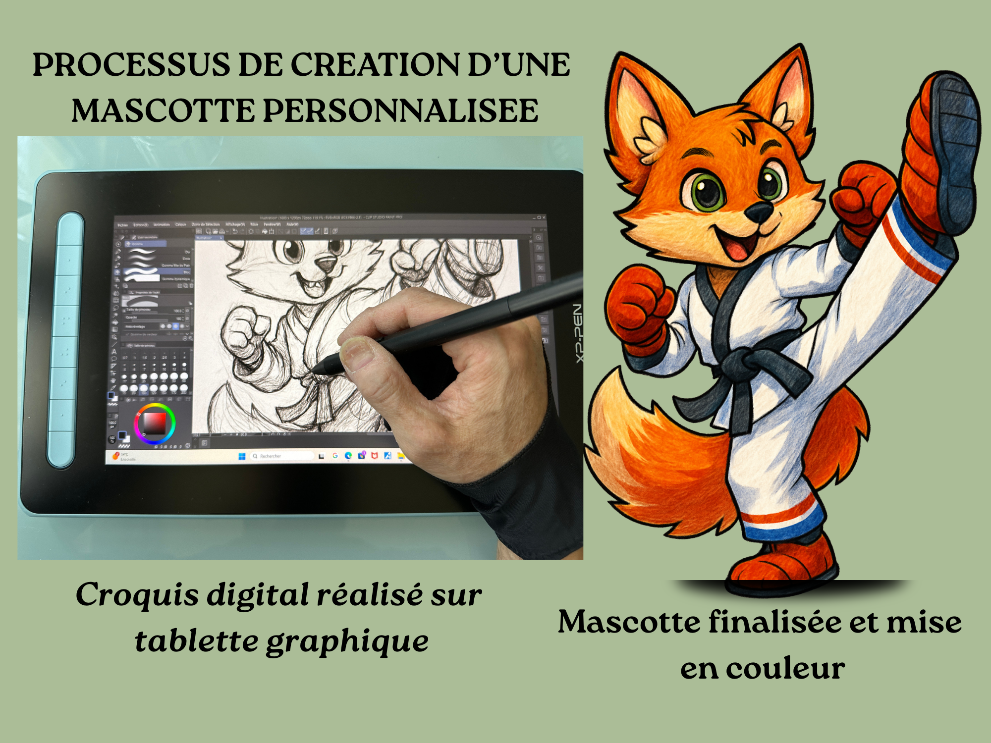 J’utilise des outils d’illustration digitale professionnels et des aides IA créatives pour accélérer la recherche visuelle. Chaque illustration finale est retravaillée, corrigée et personnalisée manuellement afin d’obtenir une mascotte unique et cohérente.