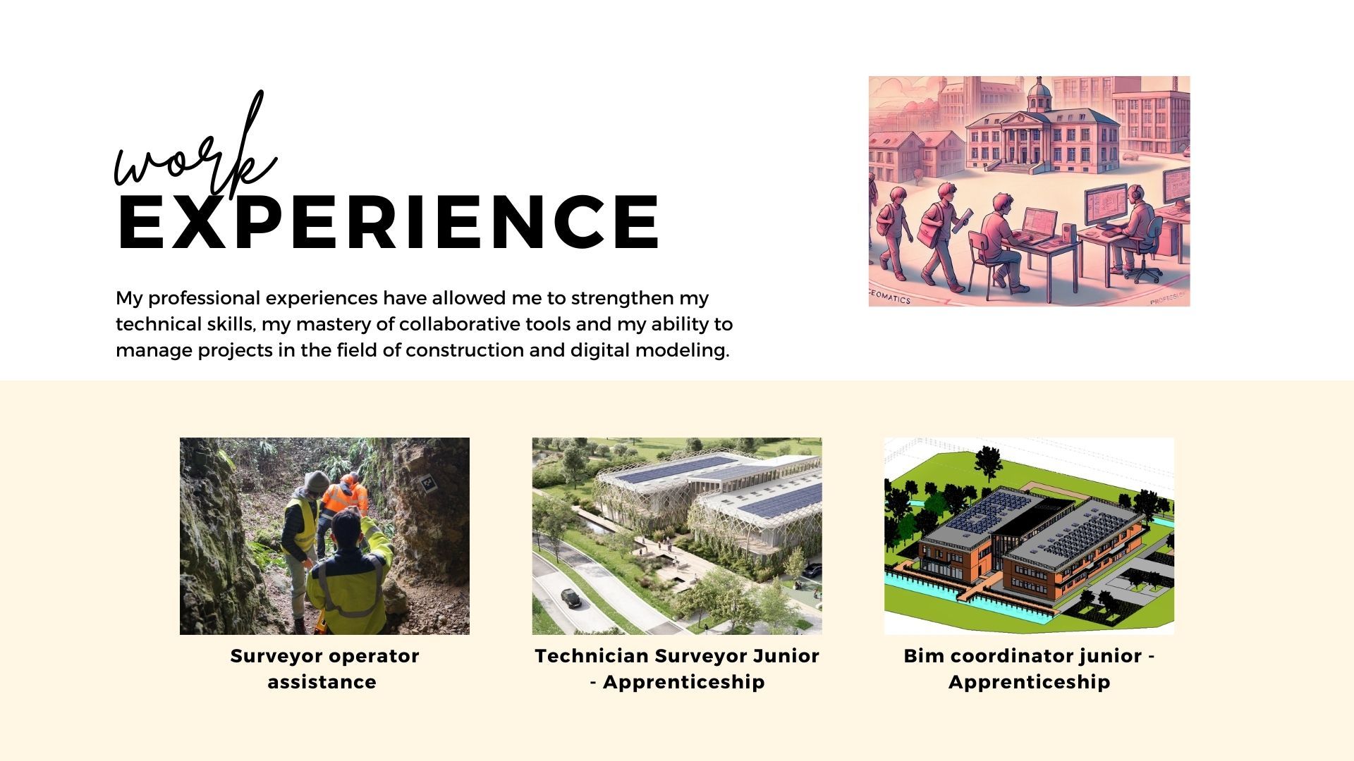 Grâce à mon parcours diversifié, allant de la modélisation 3D à la coordination BIM, en passant par l'analyse de l'existant en tant que technicien Géomètre-Topographe, j’ai acquis une solide expertise dans la gestion et la structuration de données numériques complexes. Aujourd'hui, j’accompagne les entreprises dans la mise en place de solutions BIM adaptées à leurs besoins, afin d’améliorer la productivité et la qualité des projets.