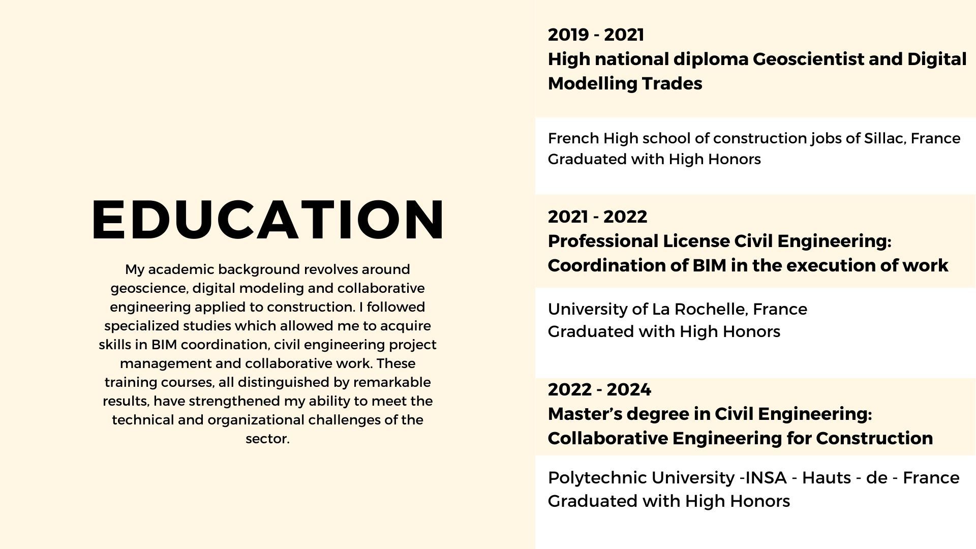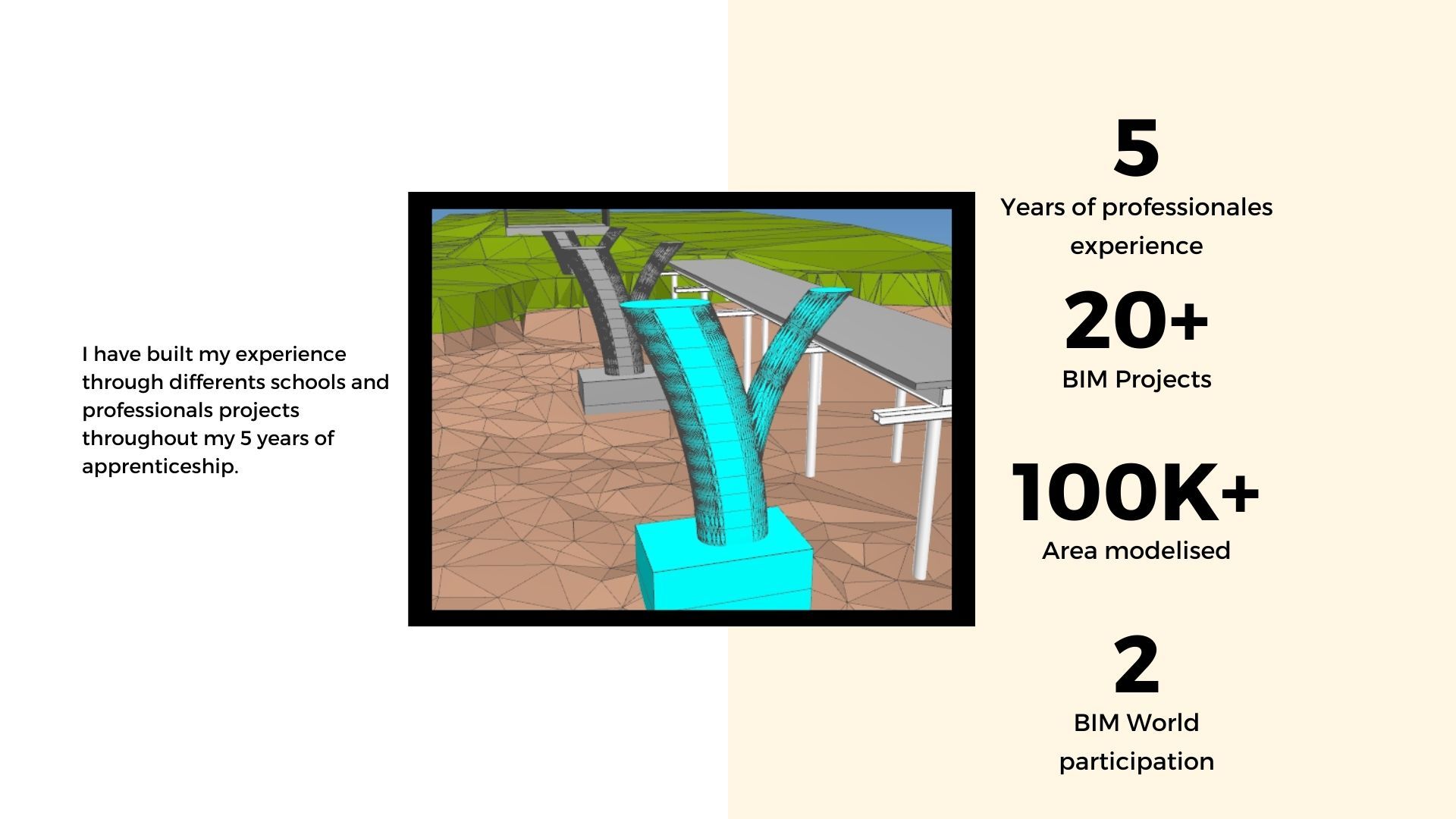 Fort de 5 ans d’expérience en alternance dans le secteur de la construction, je suis passionné par l’univers du BIM (Building Information Modeling) et engagé à le rendre accessible à tous. Mon objectif est clair : standardiser et démocratiser l'utilisation du BIM pour optimiser les projets et améliorer la collaboration entre les parties prenantes.