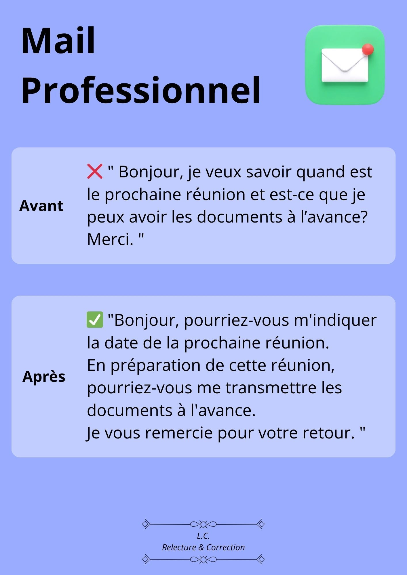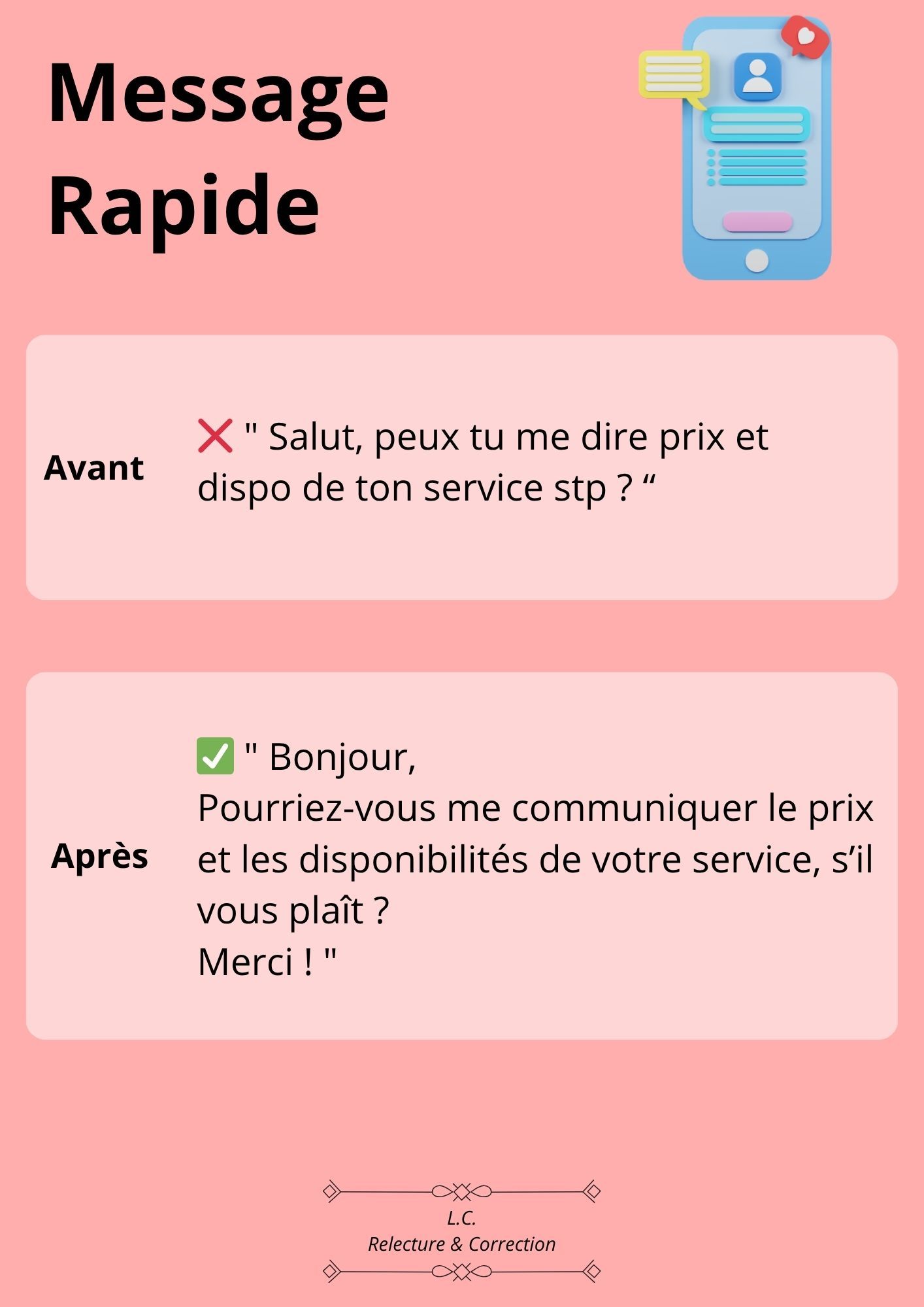 Que ce soit vos messages professionnels, vos posts ou vos mails importants, je corrige et reformule vos phrases pour qu’elles soient prêtes à envoyer.