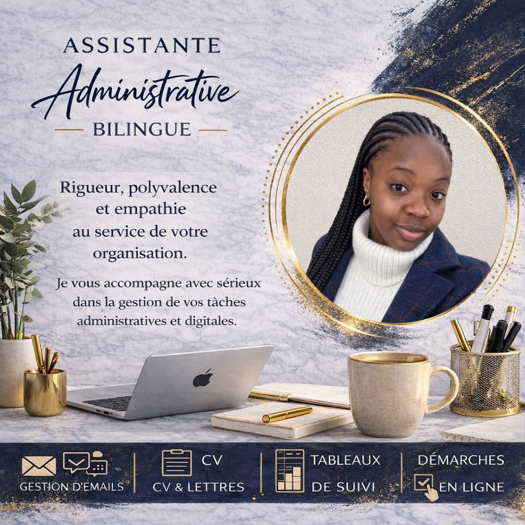 Je peux vous aider dans différentes missions telles que la gestion et l’organisation de vos e-mails en français et en anglais, la rédaction et l’amélioration de CV et de lettres de motivation en français ou en anglais, la création de tableaux de suivi simples pour suivre l’évolution de votre activité ou de vos clients, ainsi que l’accompagnement dans certaines démarches administratives en ligne.