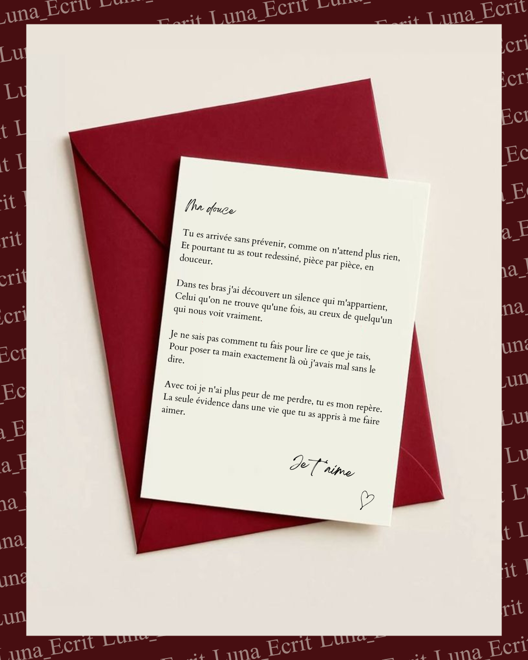 Chaque commande est traitée avec soin. Je ne livre jamais un texte générique, je prends le temps de vous connaître pour que chaque mot soit juste.