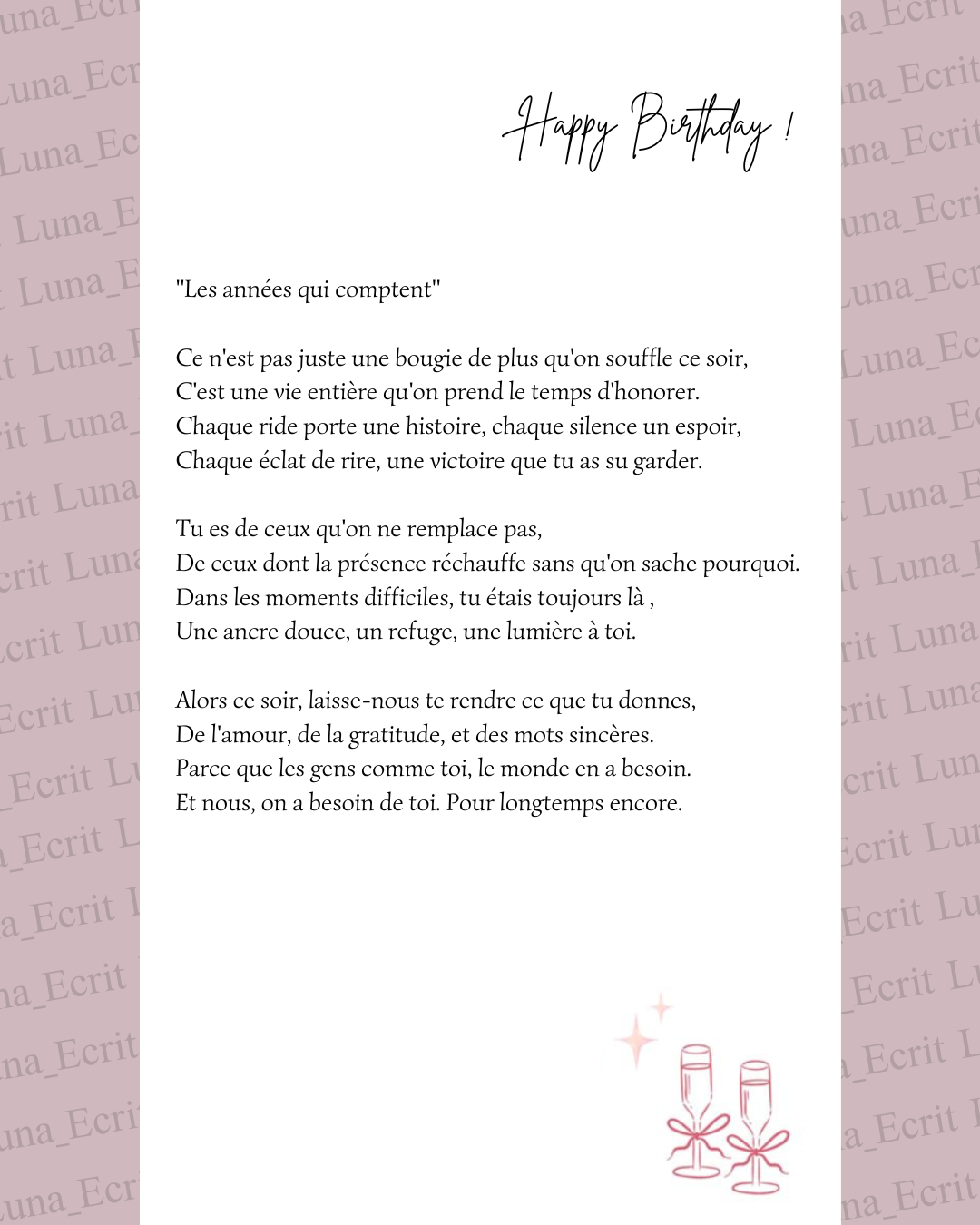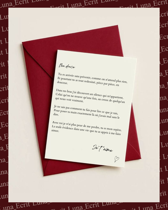 Vous recevrez votre texte en format simple, prêt à copier-coller ou lire à voix haute. En option premium, je vous propose également une belle mise en page illustrée. Un rendu soigné que vous pouvez imprimer, encadrer ou offrir tel quel.