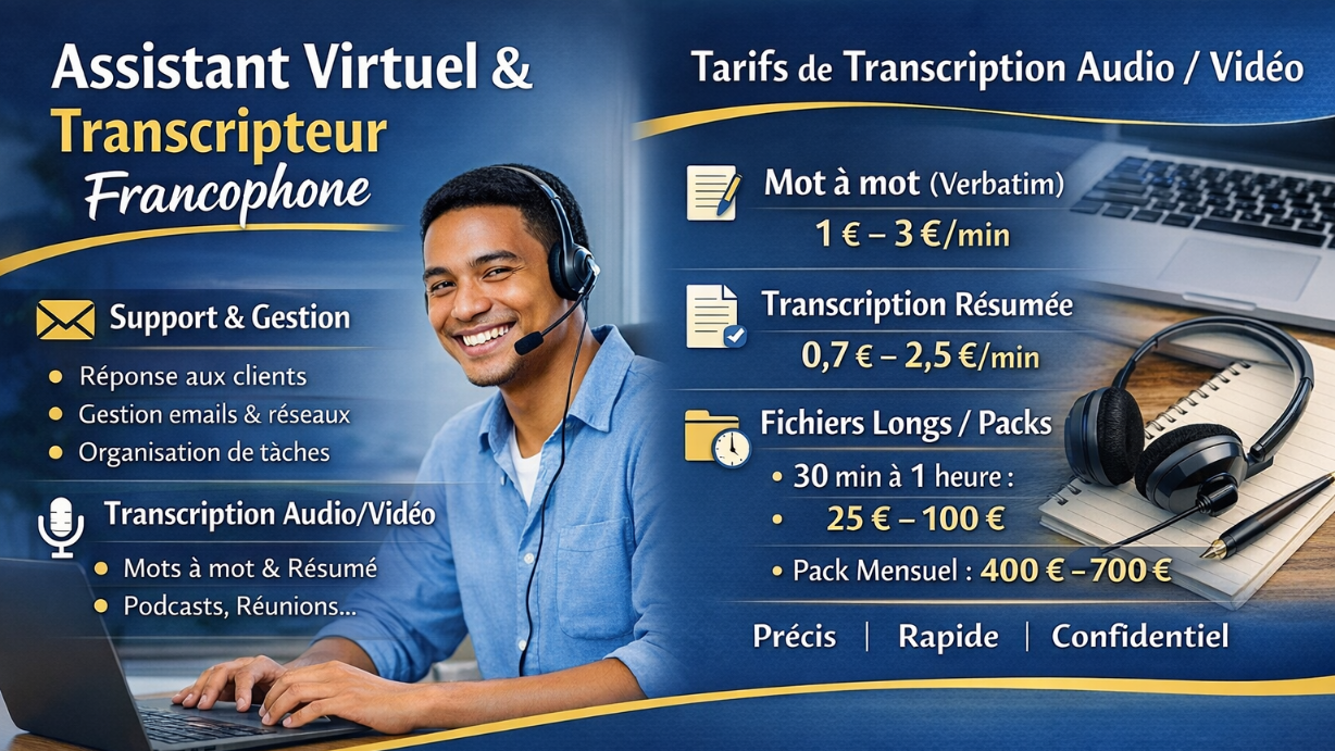 Tarifs : 0,7 € – 1,5 € / minute audio *Fichiers longs ou projets réguliers Projet de 30–60 minutes d’audio ou vidéo : 25 € - 55 € Pack mensuel / missions régulières : 400 € – 700 € par mois selon volume de travail