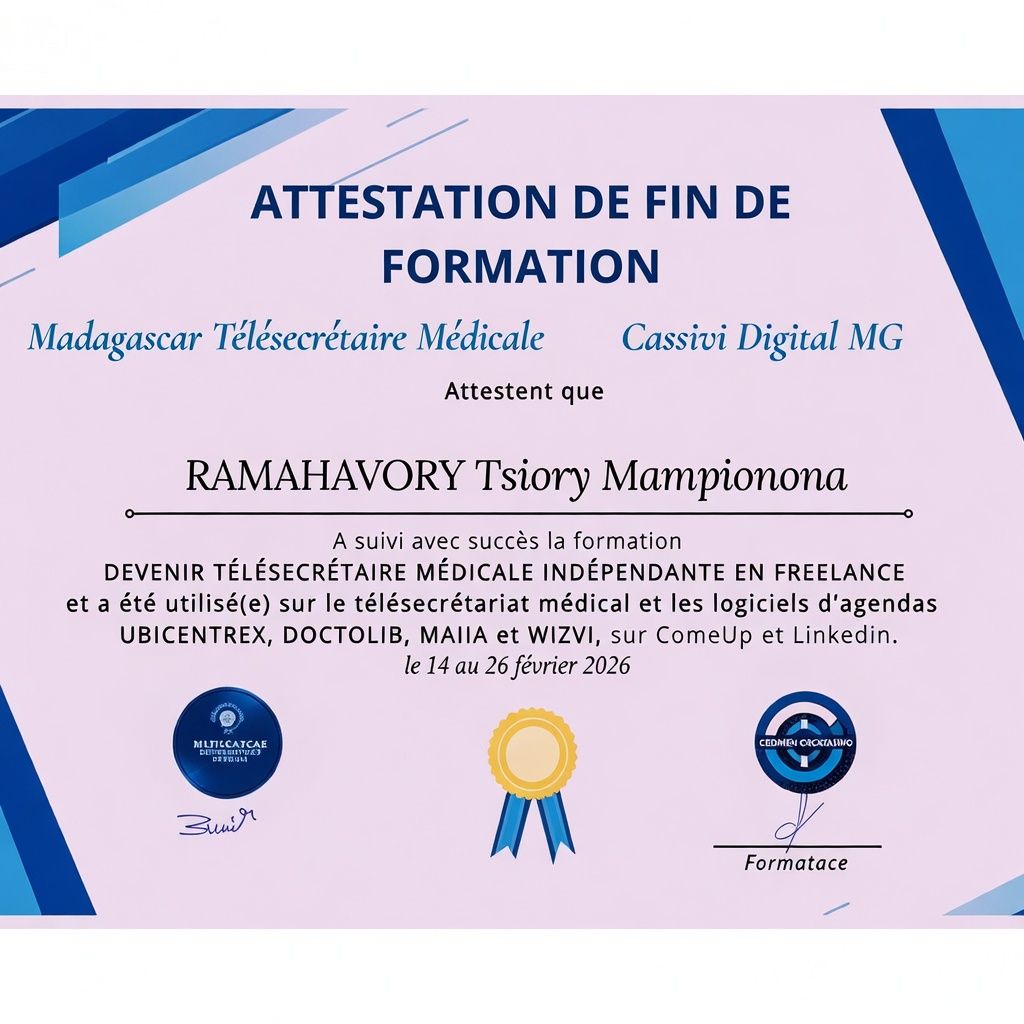 Je suis Tsiory Mampionona RAMAHAVORY. En tant que télésecrétaire médicale, mon travail consiste exactement à absorber cette charge logistique pour vous rendre votre disponibilité d'esprit.