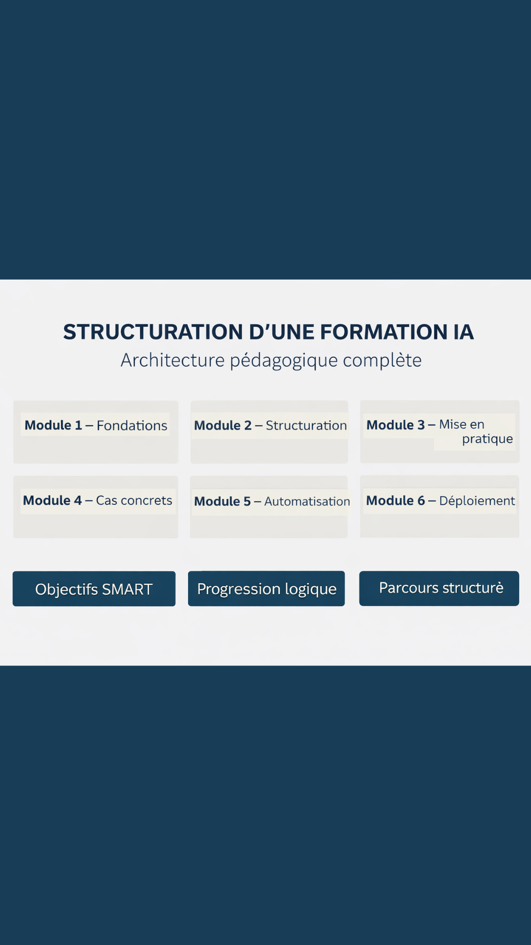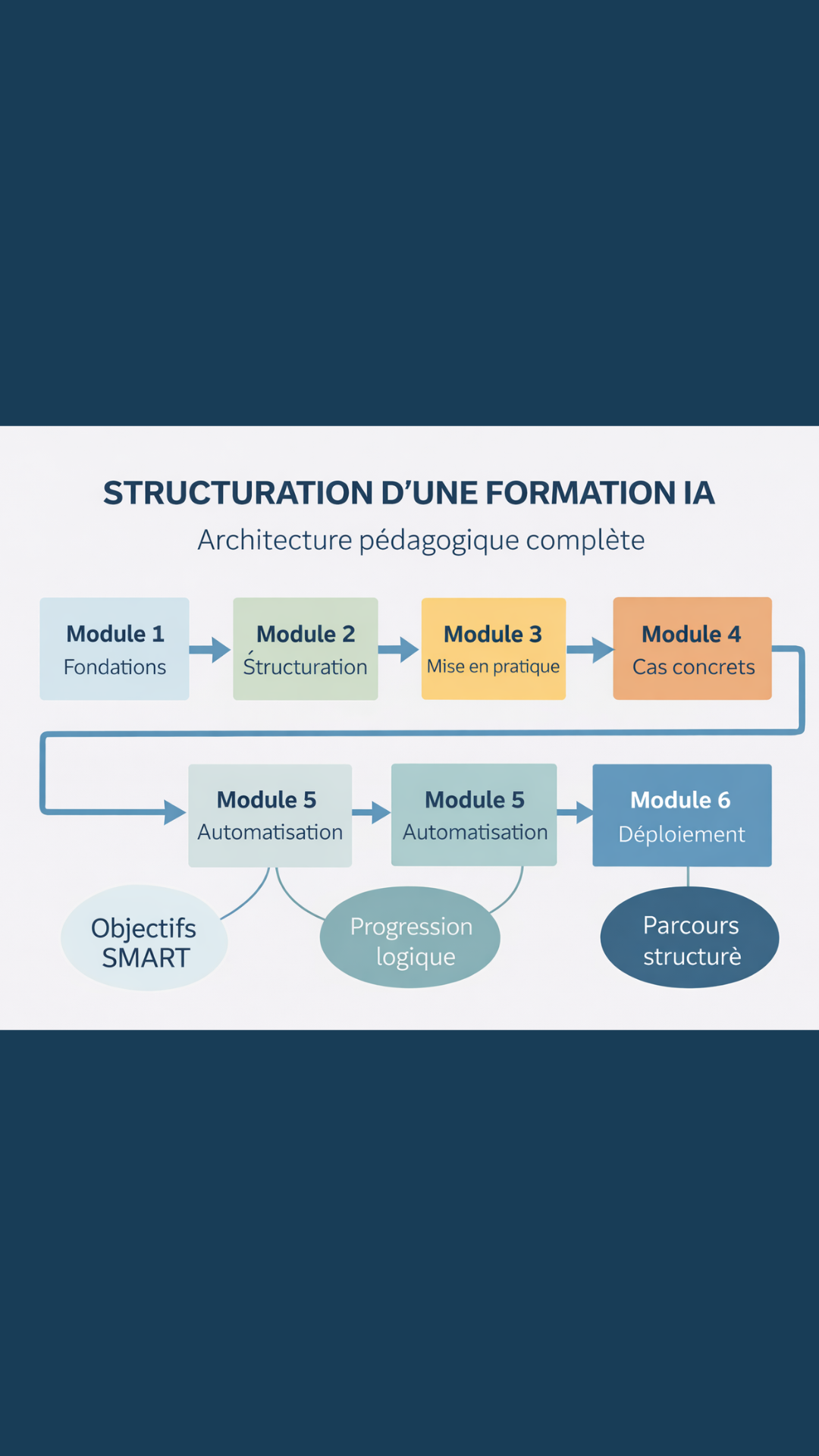 ✔ Structuration en modules cohérents ✔ Objectifs SMART ✔ Parcours logique ✔ Optimisation via IA générative ✔ Méthodologie issue de la certification FPA