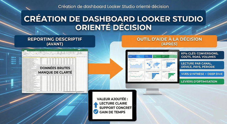 J’interviens notamment sur : • audit & restructuration marketing • publicité digitale (Google Ads, Meta Ads) • tracking & analytics • dashboards orientés décision • accompagnement stratégique