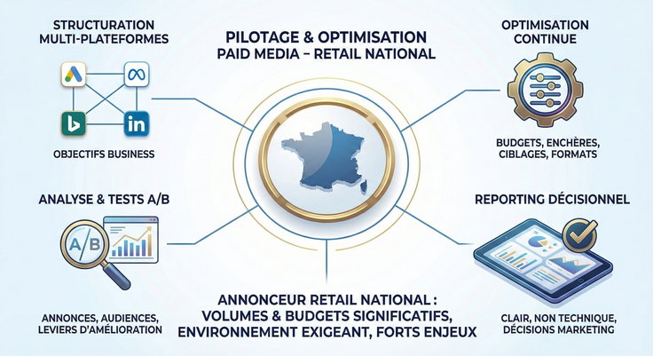 Pilotage et optimisation de campagnes Paid Media multi-canaux (Google, Meta, Bing, LinkedIn), analyse des KPIs, audits de performance, dashboards décisionnels et recommandations stratégiques orientées ROI. -