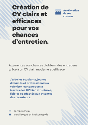 Création et optimisation de CV professionnels modernes et adaptés aux exigences des recruteurs. Accompagnement d’étudiants, jeunes diplômés et professionnels dans la valorisation de leur parcours afin d’augmenter leurs chances d’obtenir des entretien