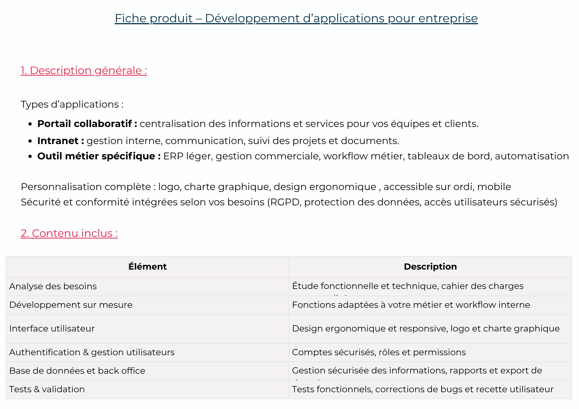 Mise en place d'un process interne Gestion documentaire Création de fiches produits et services, grille tarifaire, etc Recrutement Rédaction des contrats de travail, de vente Dossier de subvention -