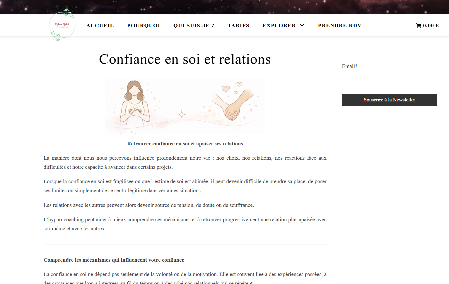 Grâce à mon expérience dans l’accompagnement humain (hypnothérapie et coaching) et mes compétences techniques (Canva, WordPress, WooCommerce), je ne me contente pas de “faire du design” : je vous aide à transmettre un message qui a du sens et qui parle réellement à votre audience.