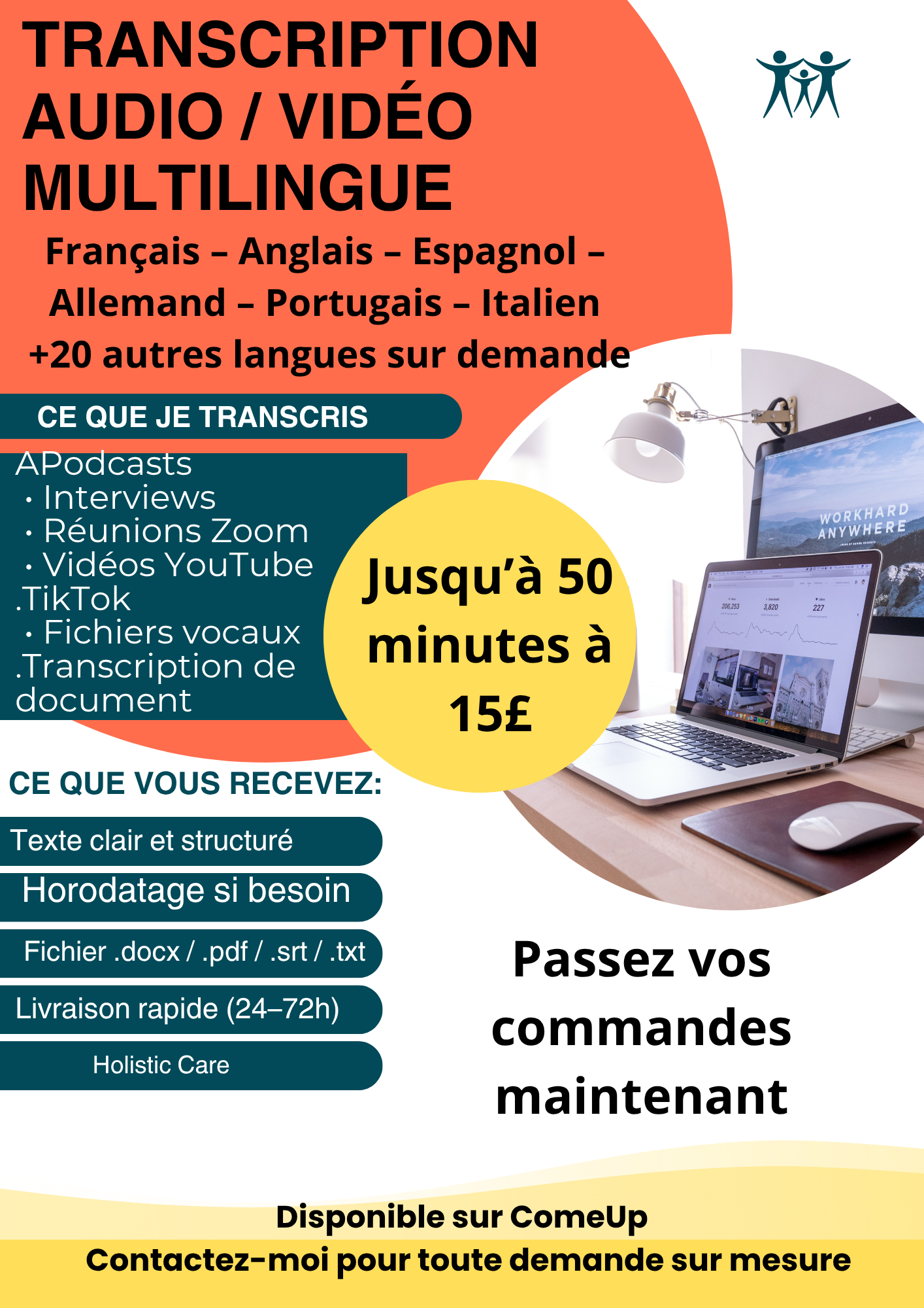 Transcription audio/vidéo multilingue avec mise en forme claire et sans fautes.