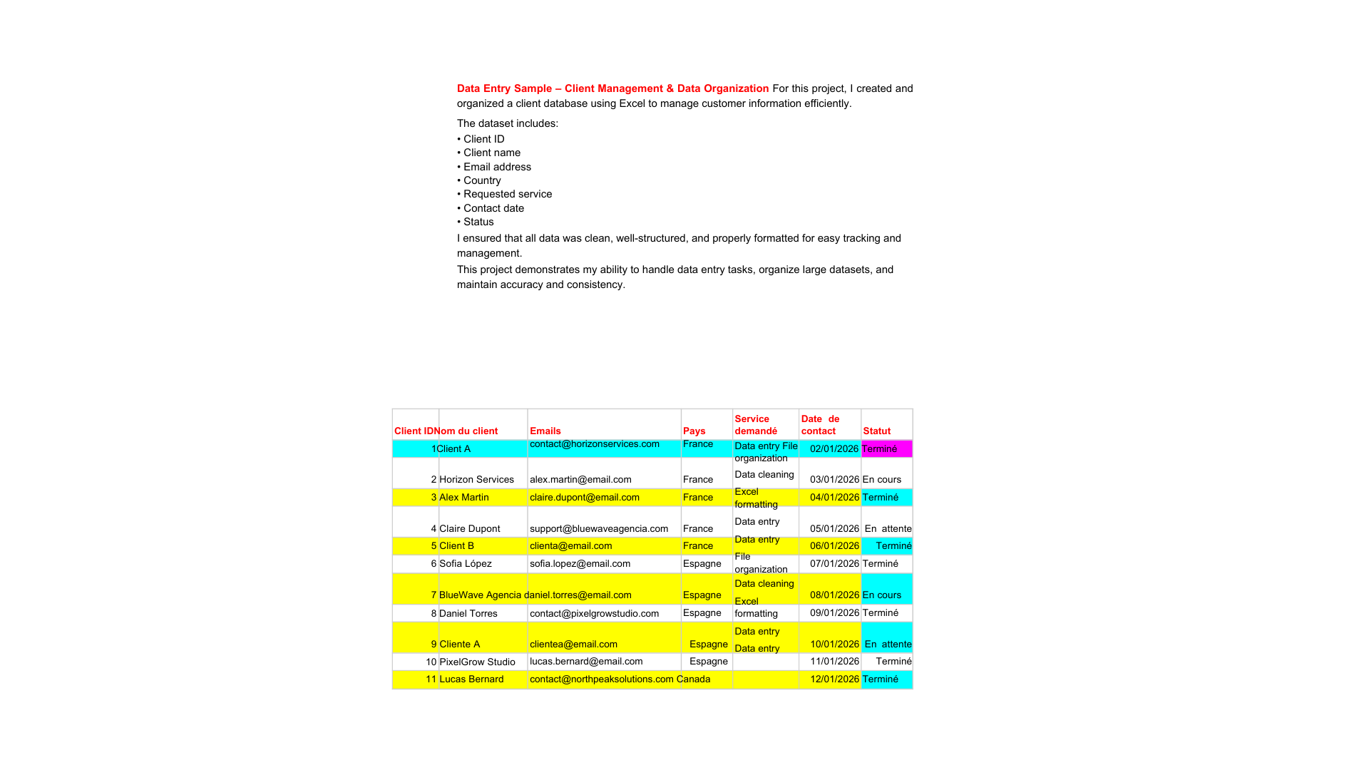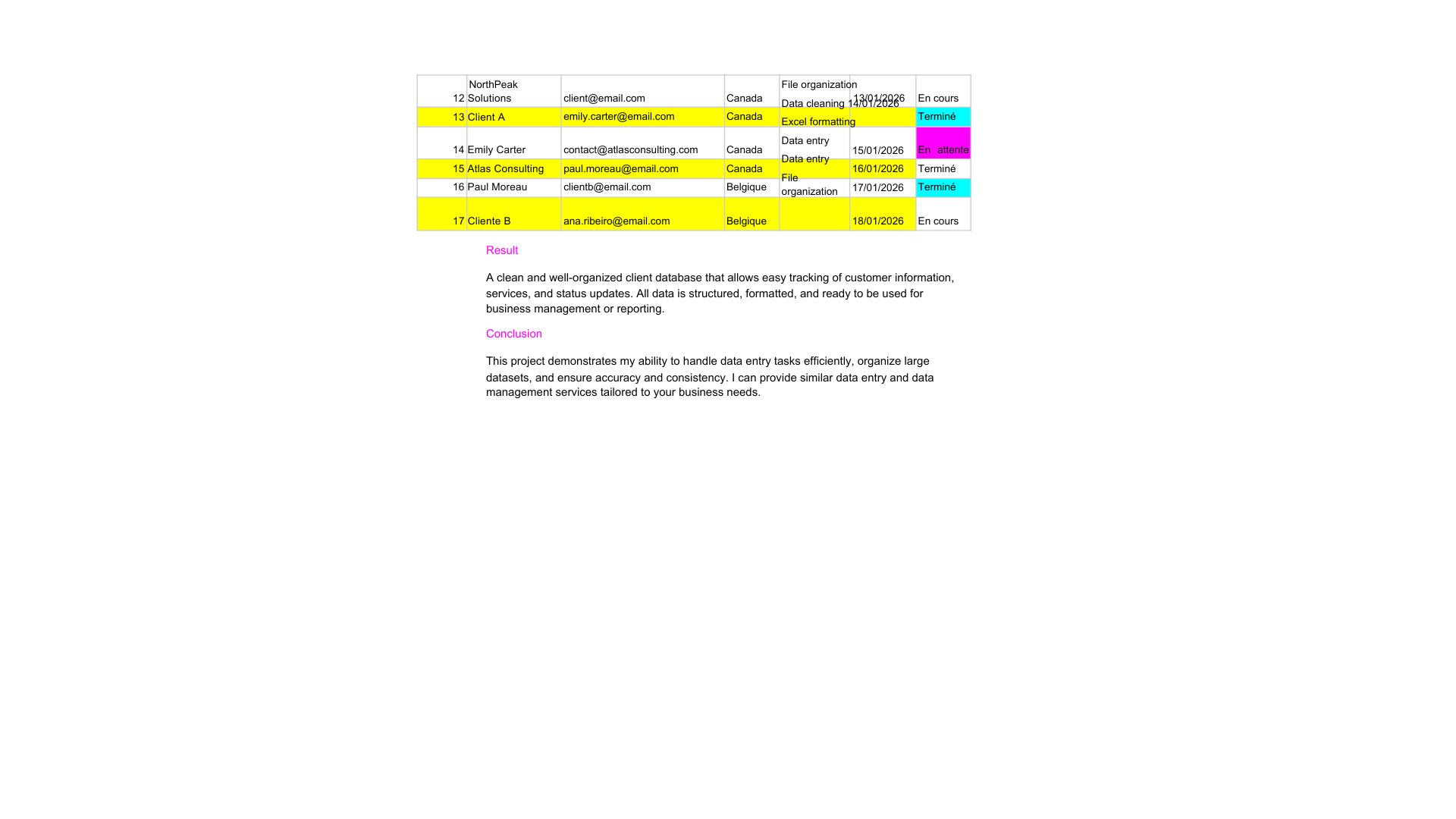 J’ai accompagné une petite entreprise e-commerce dans l’organisation et la mise à jour de sa base de données clients. Ma mission consistait à nettoyer les données, corriger les erreurs et structurer les informations -