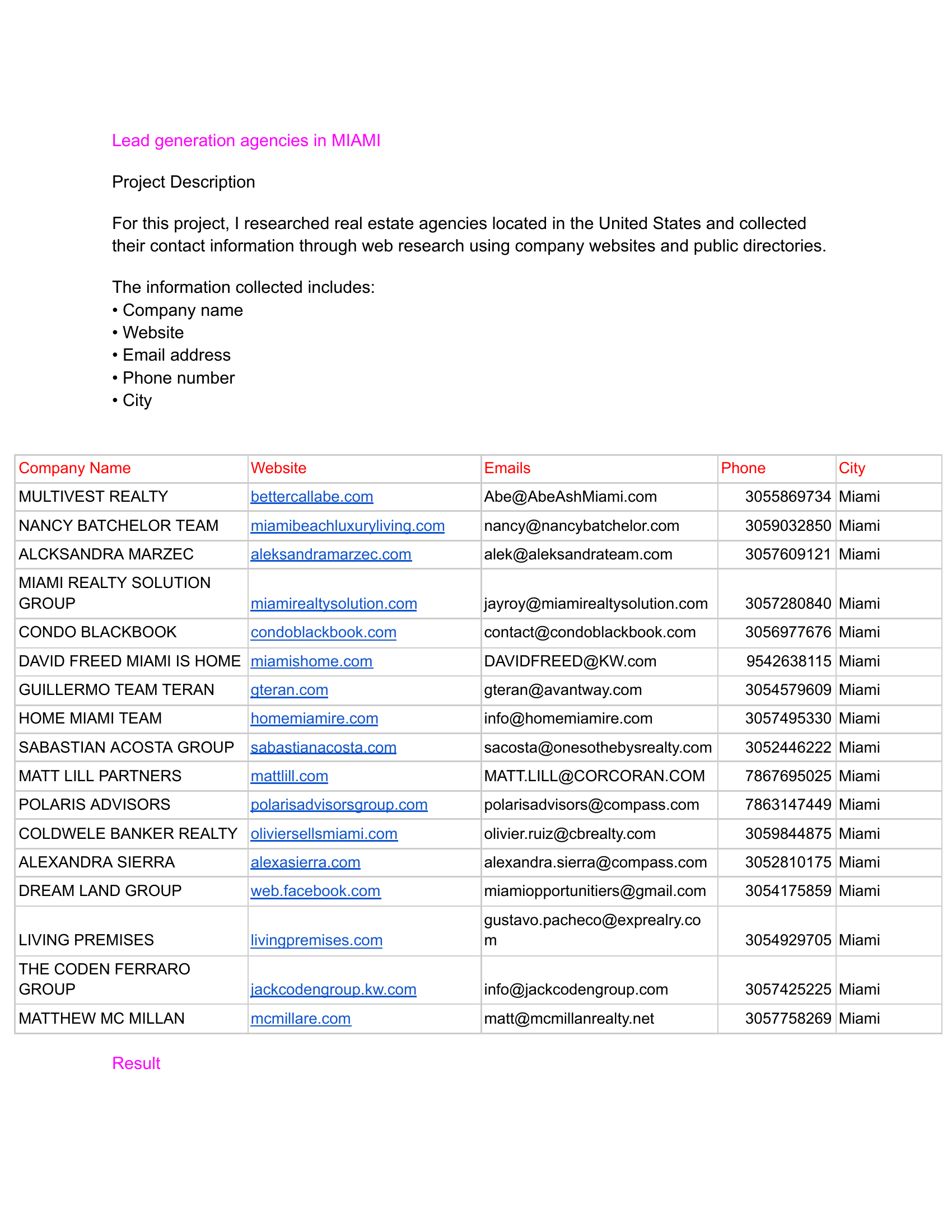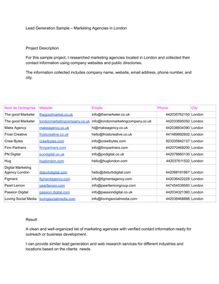 J’ai aidé une agence marketing à trouver de nouveaux prospects qualifiés pour ses campagnes de prospection. recherche d’entreprises ciblées collecte d’informations (site web, email, téléphone) création d’une base de données de prospects