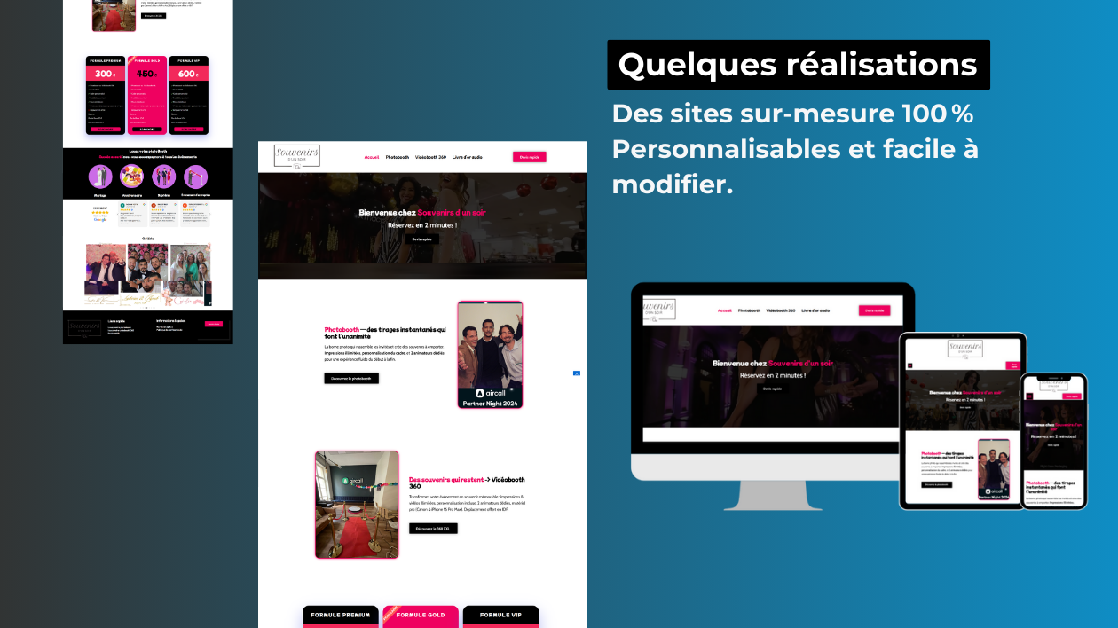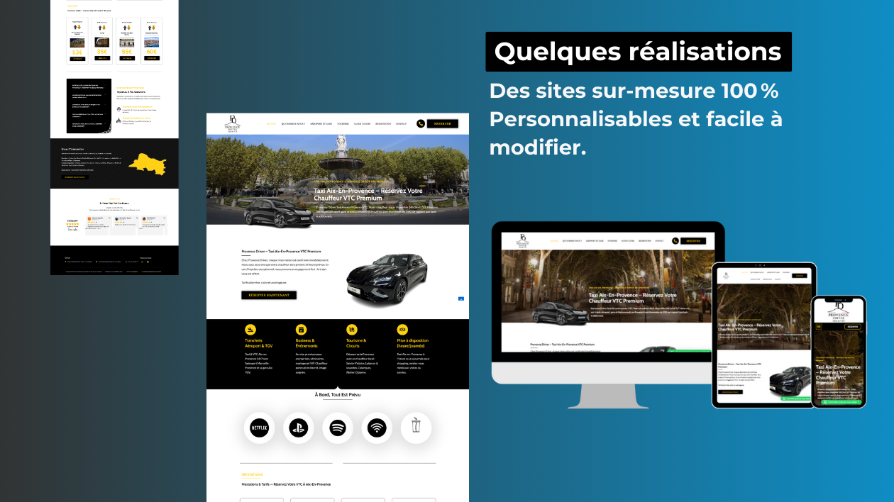 Je conçois des sites WordPress modernes, responsives, optimisés pour Google, mais surtout axés sur le retour sur investissement : design impactant, contenu structuré, SEO de base, tunnel de contact, calendrier de réservation, intégration WhatsApp, paiement en ligne… chaque détail est pensé pour servir votre business.