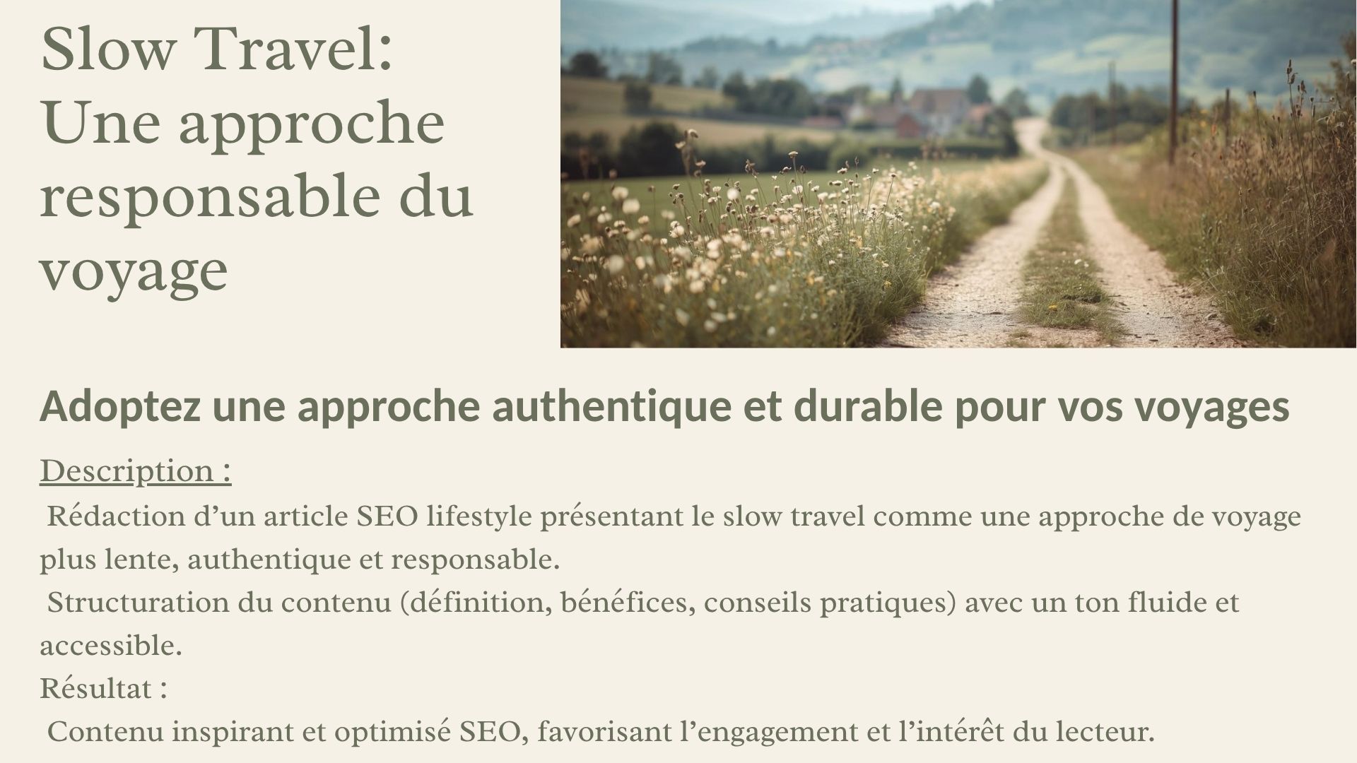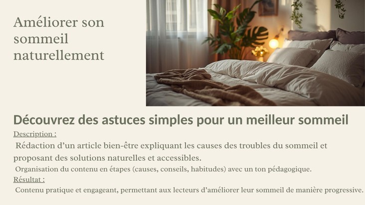 Je rédige aussi des contenus lifestyle (bien-être, sommeil, voyage).
