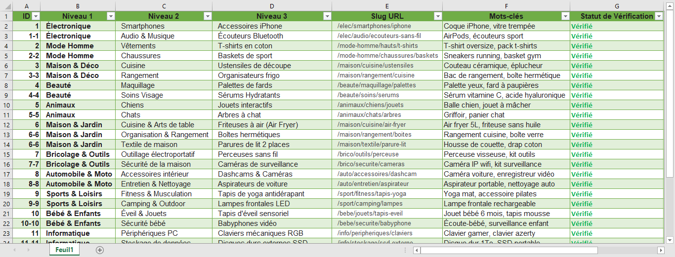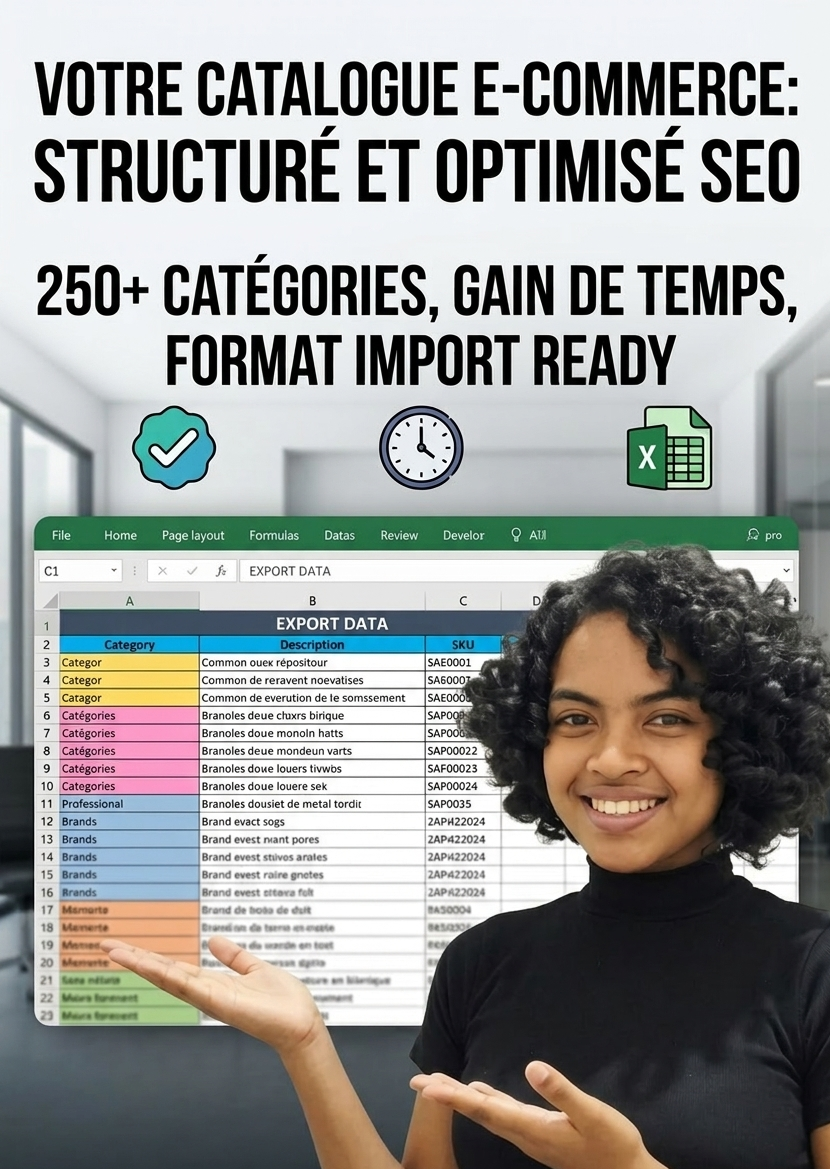 Freelance Expert Data & E-commerce. Diplômée en Gestion, j'architecture vos catalogues massifs (+250 catégories) sur Excel. Optimisation SEO (Slugs/Keywords) et nettoyage de bases de données pour import Shopify/WooCommerce. Rigueur et Rapidité.
