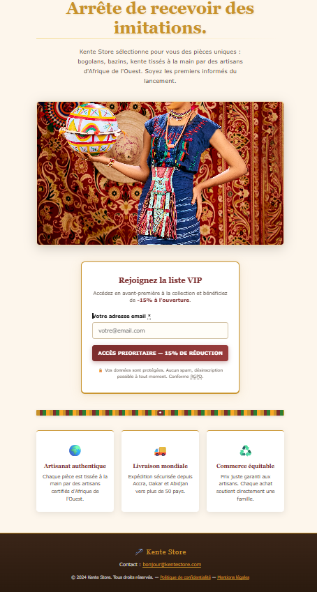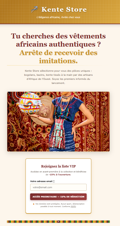 Projet référence : Kente Store — landing page complète, blog SEO, séquence email automatisée et dashboard leads en temps réel.