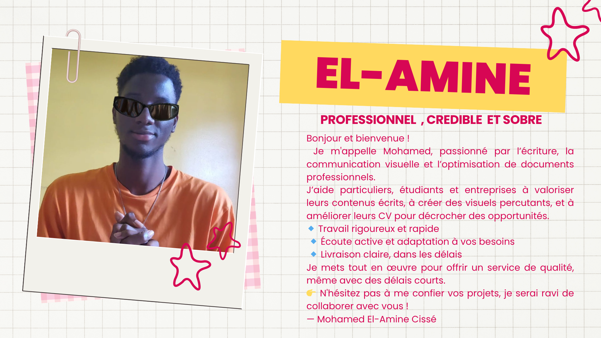 Bonjour et bienvenue ! Je m'appelle Mohamed, passionné par l’écriture, la communication visuelle et l’optimisation de documents professionnels.
