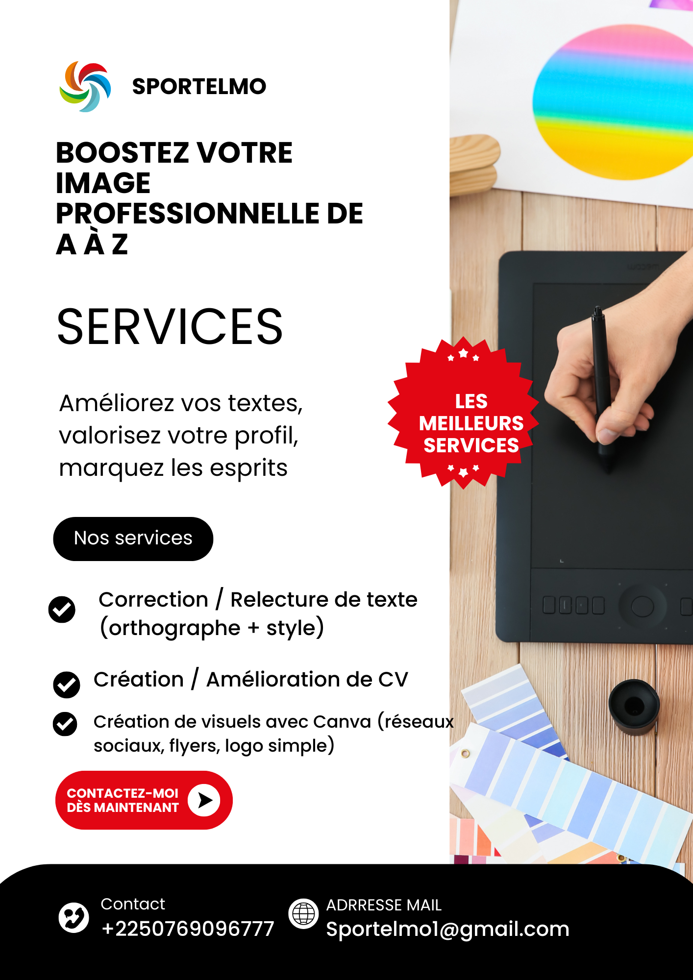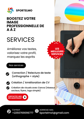 J’aide particuliers, étudiants et entreprises à valoriser leurs contenus écrits, à créer des visuels percutants, et à améliorer leurs CV pour décrocher des opportunités.
