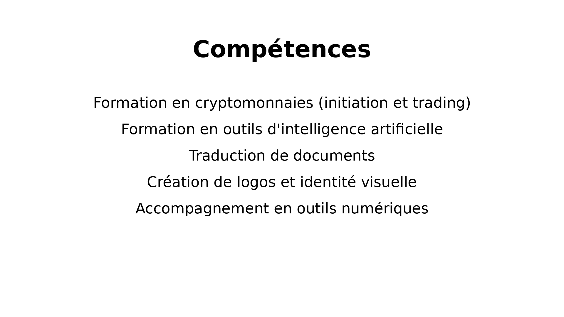 Formateur passionné en technologies numériques, spécialisé dans les cryptomonnaies, l’intelligence artificielle et les outils digitaux modernes. J’accompagne particuliers et entreprises dans la compréhension et l’utilisation des monnaies numériques, l’apprentissage de l’IA pour améliorer la productivité, ainsi que les solutions de traduction pour faciliter la communication internationale. Je propose également des services créatifs tels que la conception de logos professionnels et l’identité visuelle pour les marques, entreprises et projets personnels. Objectif : transmettre des compétences pratiques, aider chacun à profiter des opportunités du digital et transformer les idées en projets concrets.