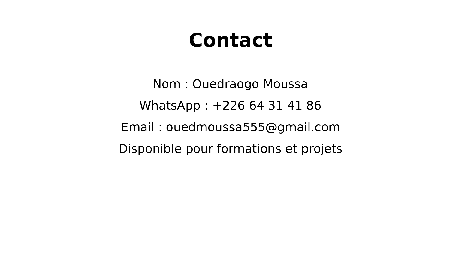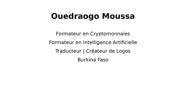 Expérience professionnelle – Ouedraogo Moussa Formateur en Cryptomonnaies et Intelligence Artificielle Indépendant | Burkina Faso | 2022 – Aujourd’hui Formation de débutants et professionnels aux bases et à l’utilisation des cryptomonnaies.