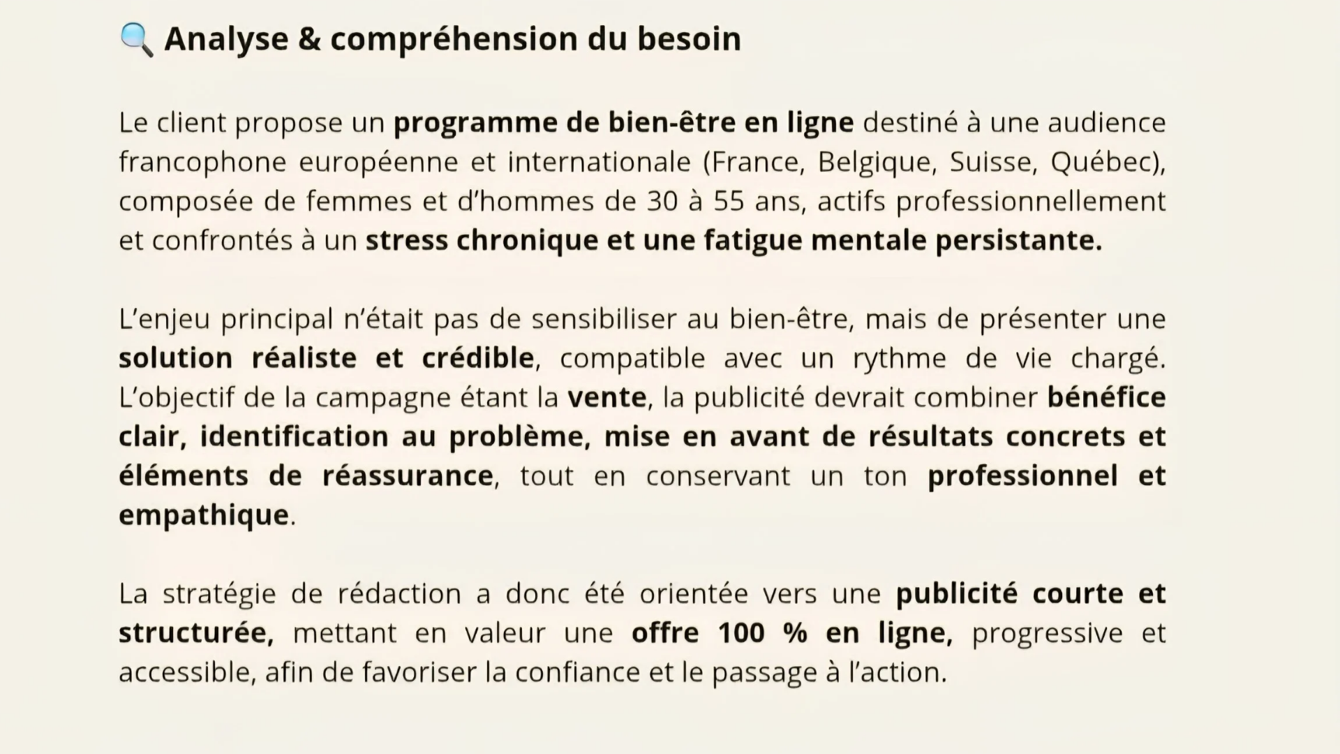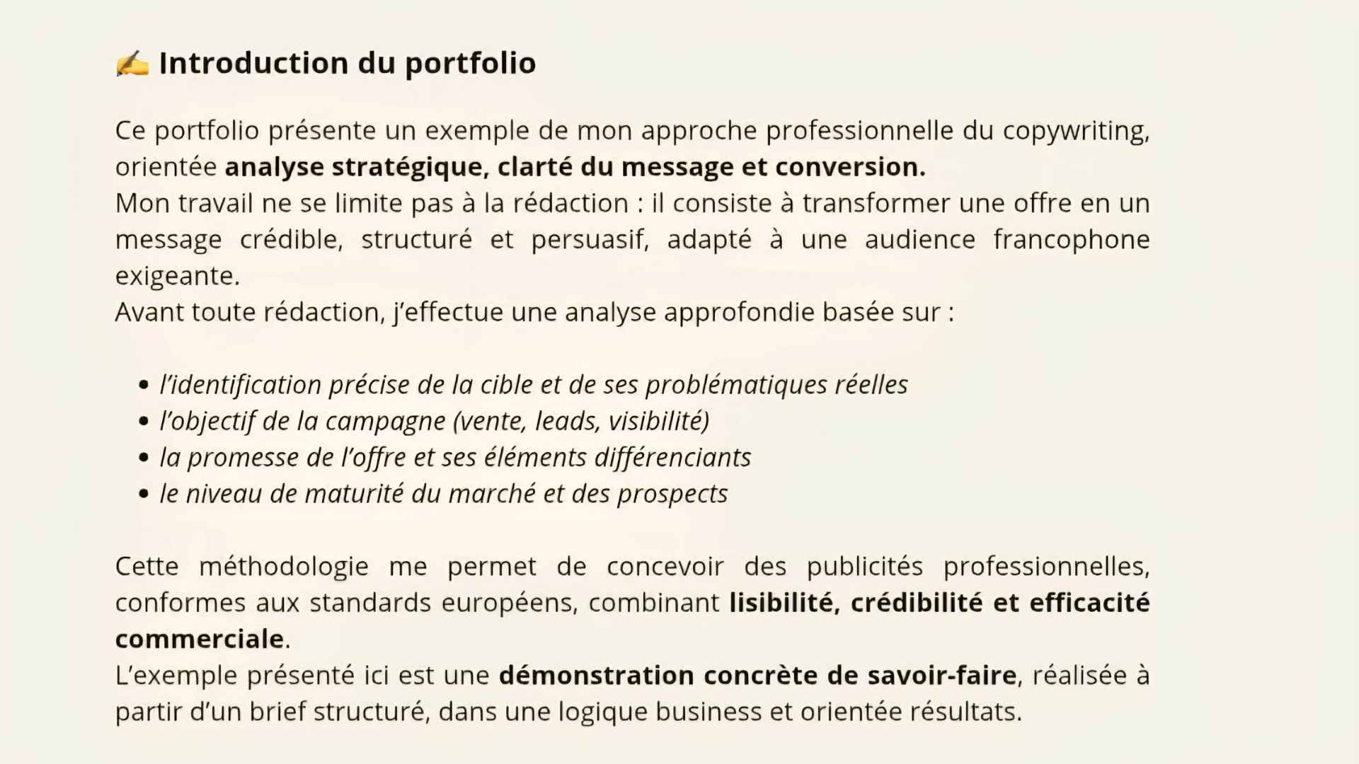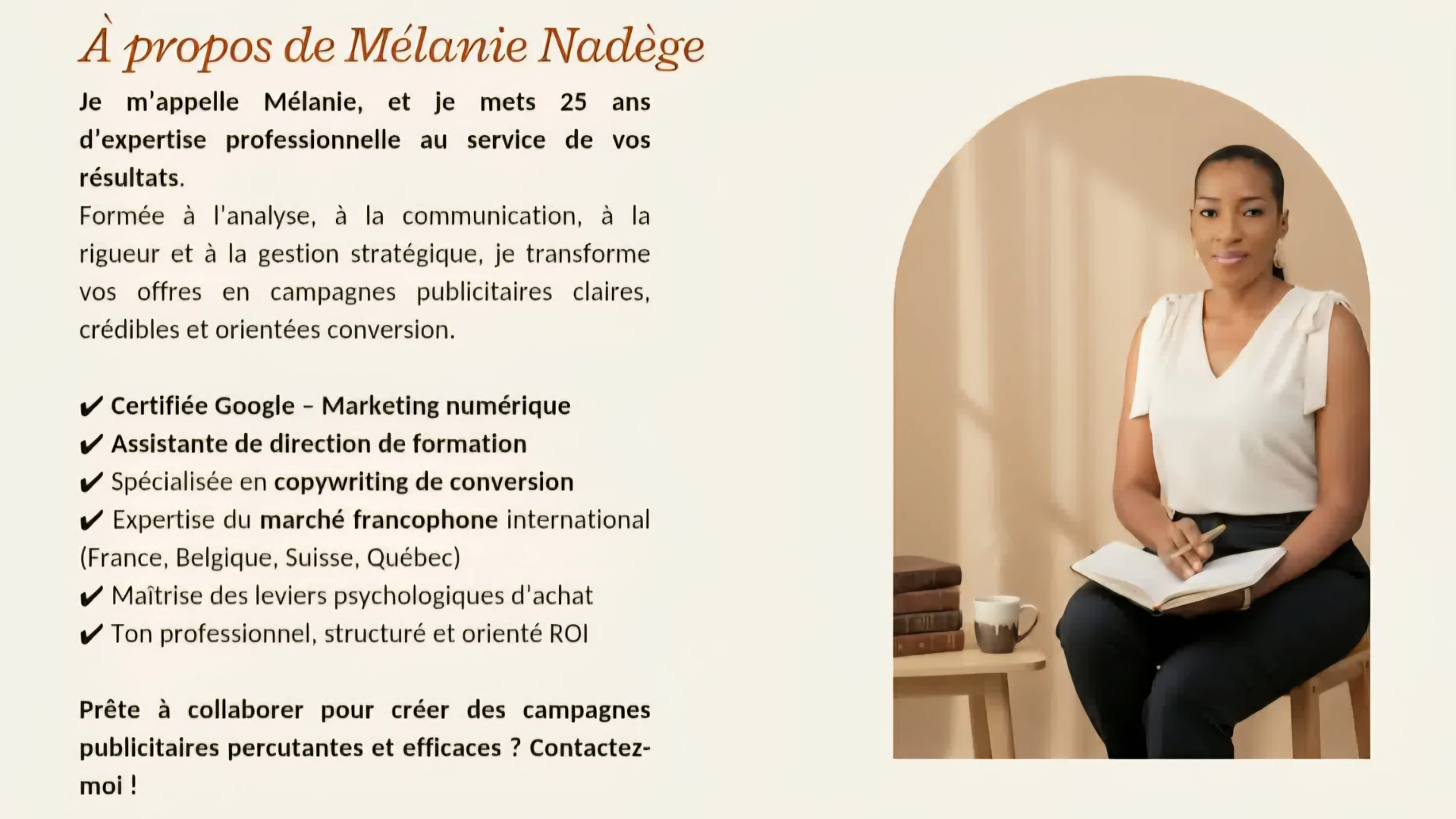 Passionnée par le copywriting de conversion, je conçois des publicités claires, crédibles et efficaces, pensées pour une audience francophone exigeante (France, Belgique, Suisse, Québec).