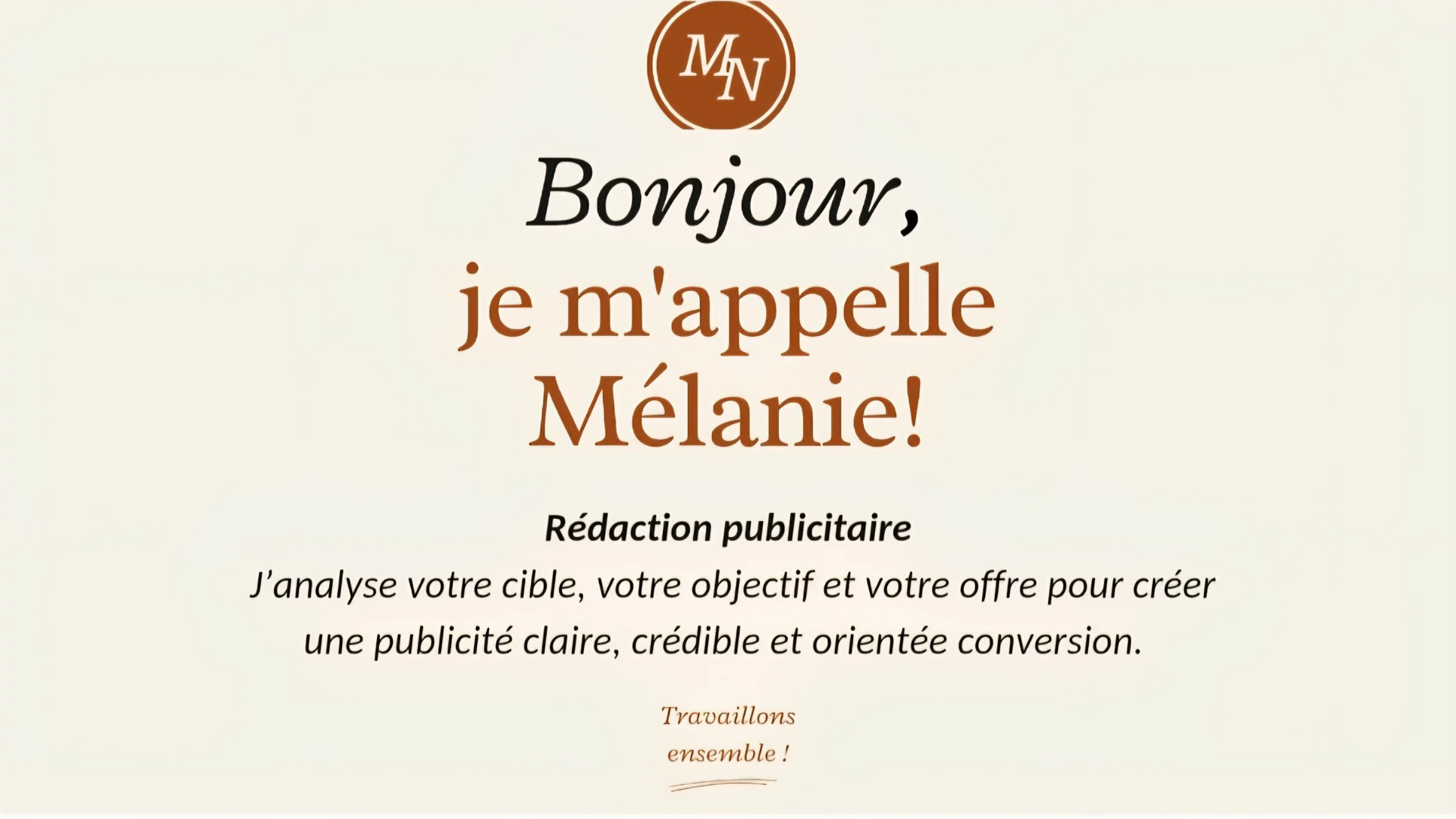 Je m’appelle Mélanie, Copywriter spécialisée en rédaction de publicités persuasives optimisées pour la conversion.