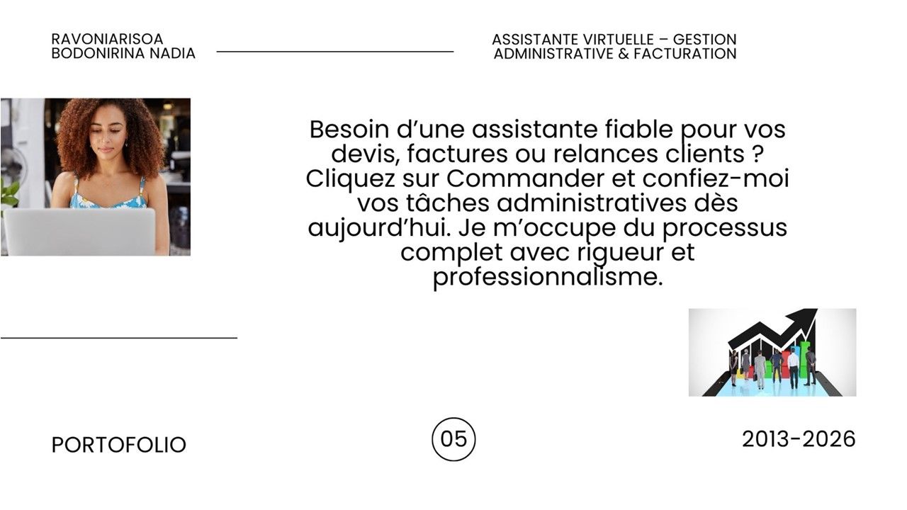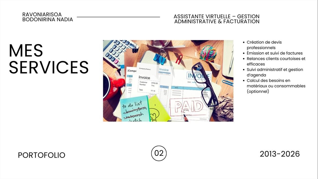 Assistante virtuelle spécialisée en gestion administrative et facturation, je prends en charge vos documents avec rigueur, confidentialité et respect des délais, afin de sécuriser votre trésorerie et améliorer votre relation client.