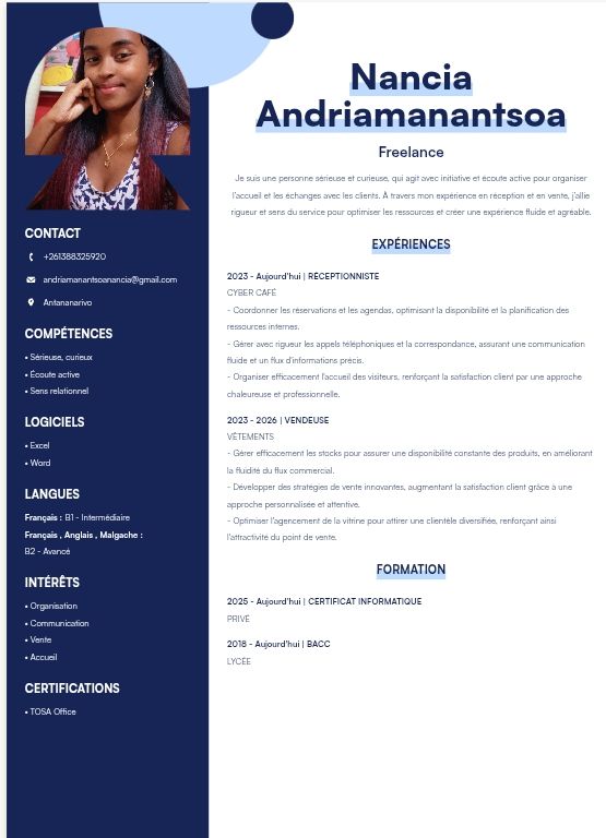 Je suis freelance spécialisée en création de documents professionnels et design graphique, avec une expérience acquise au sein d’un cyber café, où j’ai travaillé sur la création, la mise en forme et la saisie de nombreux documents pour différents clients.