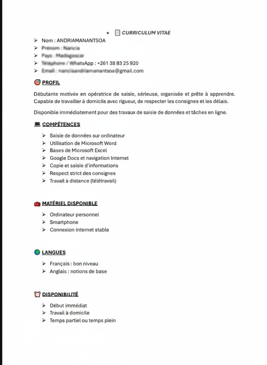 Durant mon expérience en cyber café, j’ai travaillé sur la création, la saisie et la mise en forme de documents professionnels pour différents clients (étudiants, particuliers, petites entreprises). Cette expérience m’a permis de développer