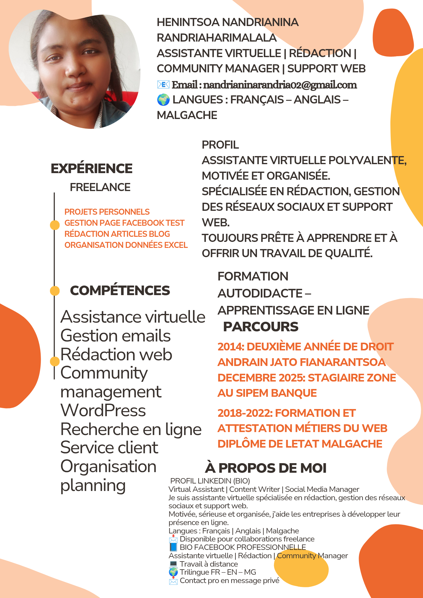 Je vais être une Assistante virtuelle /Rédaction/community manager/Support développement web