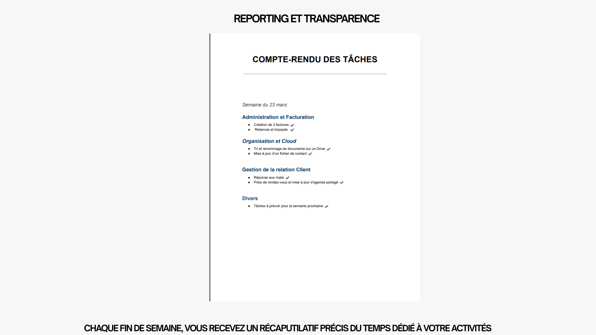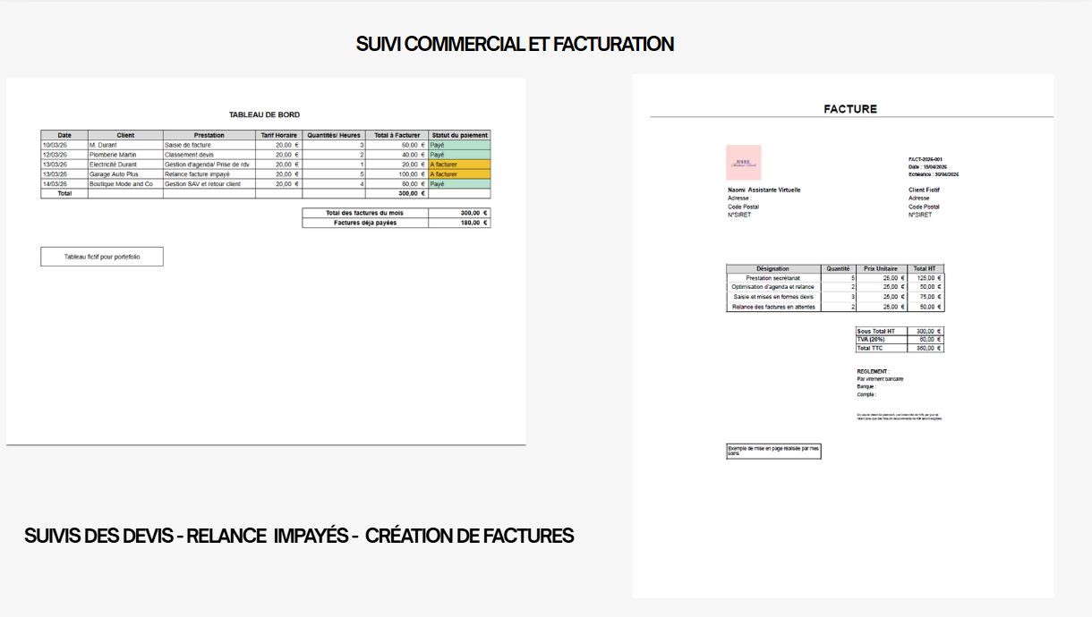 • Gestion commerciale : saisie de vos devis et factures sous 24h. • Organisation : tri de vos documents et mise en page propre. • Saisie de données : recopie et organisation de vos informations. • Gestion d'e-mails : tri de votre boîte professionnelle pour ne manquer aucune urgence. •Recherches : recherches simples sur Internet.