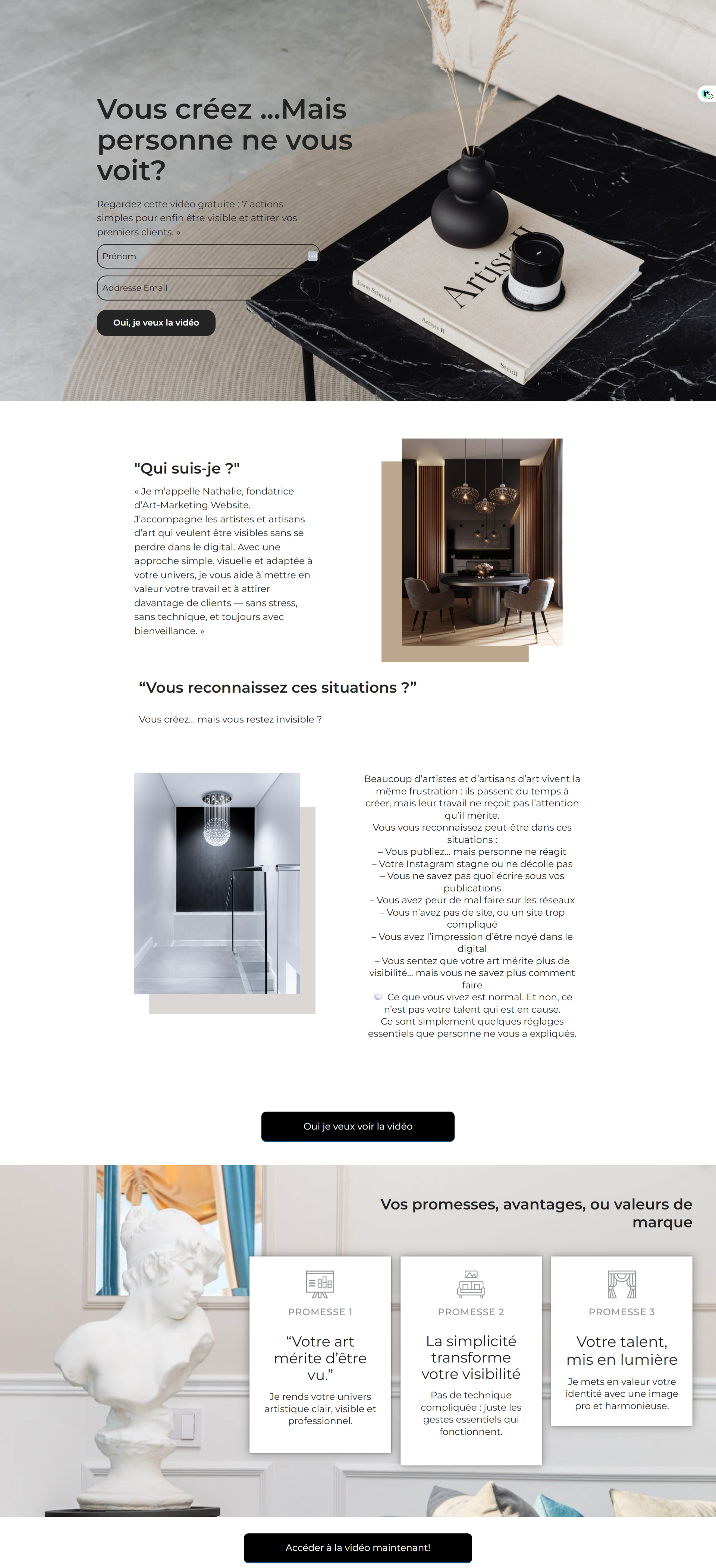 Création d’un tunnel de vente pour artistes : pages structurées, design adapté et messages orientés conversion. Objectif : valoriser les œuvres et transformer les visiteurs en clients. Tunnel clair, fluide et efficace. -