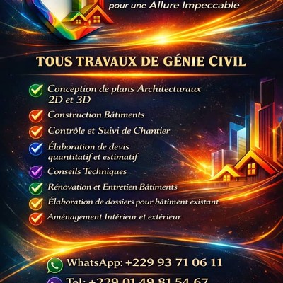 Nous façonnons des espaces d’exception. Spécialisée en génie civil et conception architecturale, notre entreprise propose des prestations de haute qualité : plans architecturaux 2D d’une grande précision, modélisation 3D immersive, aménagement intérieur et extérieur raffiné, et réhabilitation de bâtiments avec une approche moderne et durable.
