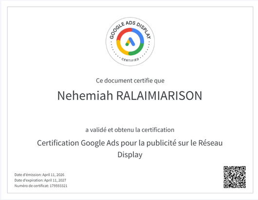 → Certification officielle Google Ads Display , obtenue via Skillshop → Maîtrise des mécanismes de diffusion display, du réseau Google, du ciblage contextuel et comportemental → Compréhension approfondie des stratégies d'enchères automatisées et de l'optimisation budgétaire Ce certificat n'est pas un badge décoratif. C'est la preuve que mes compétences ont été testées, validées et reconnues par Google lui-même.