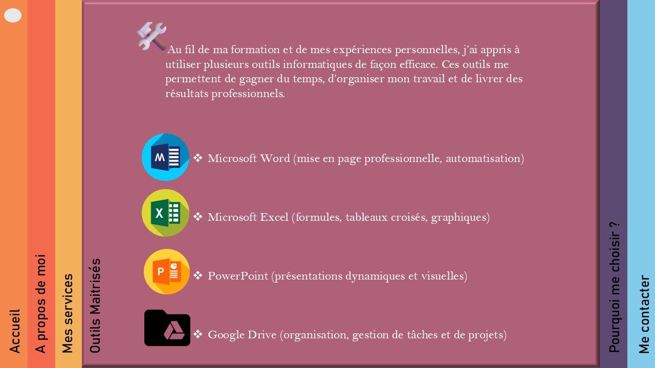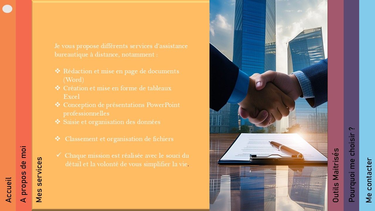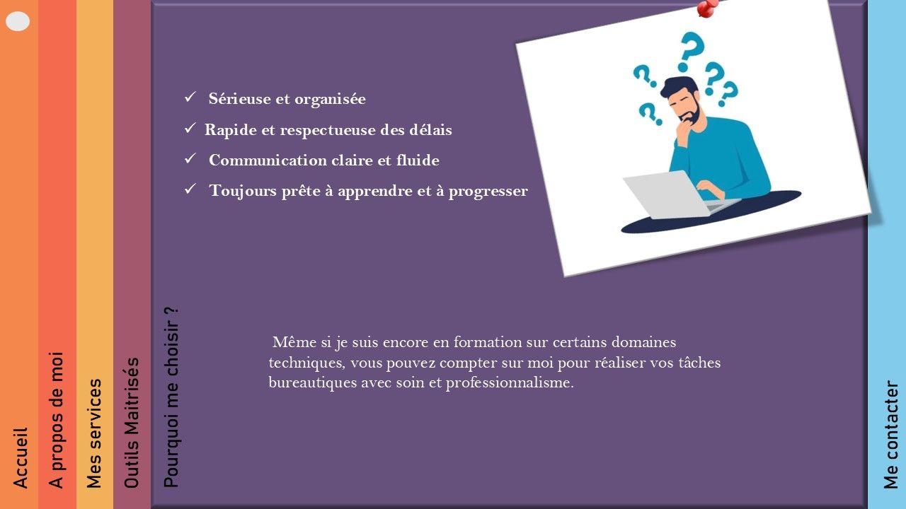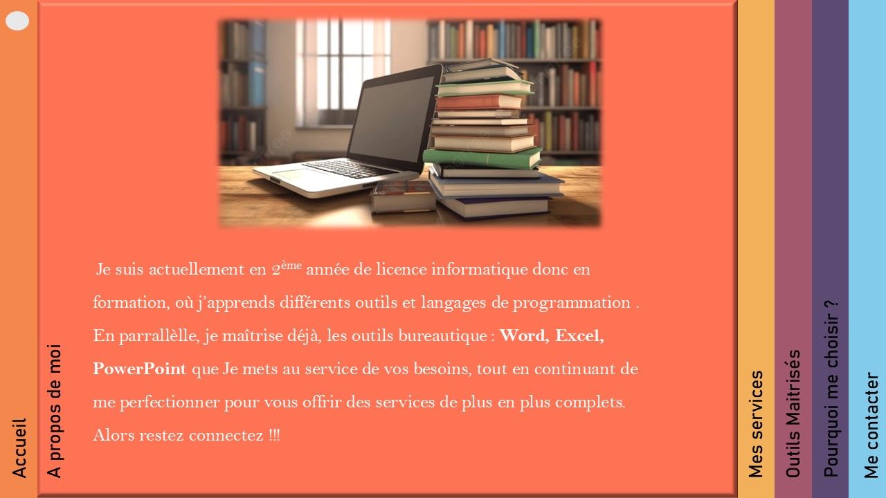 Etudiante en informatique, je vous propose des services d'assistance bureautique et administrative à distance. Mon objectif , vous faire gagner du temps et vous accompagner dans vos gestions de données : rédaction, mise en page, tableau Excel, création de présentations Powerpoint et bien plus.